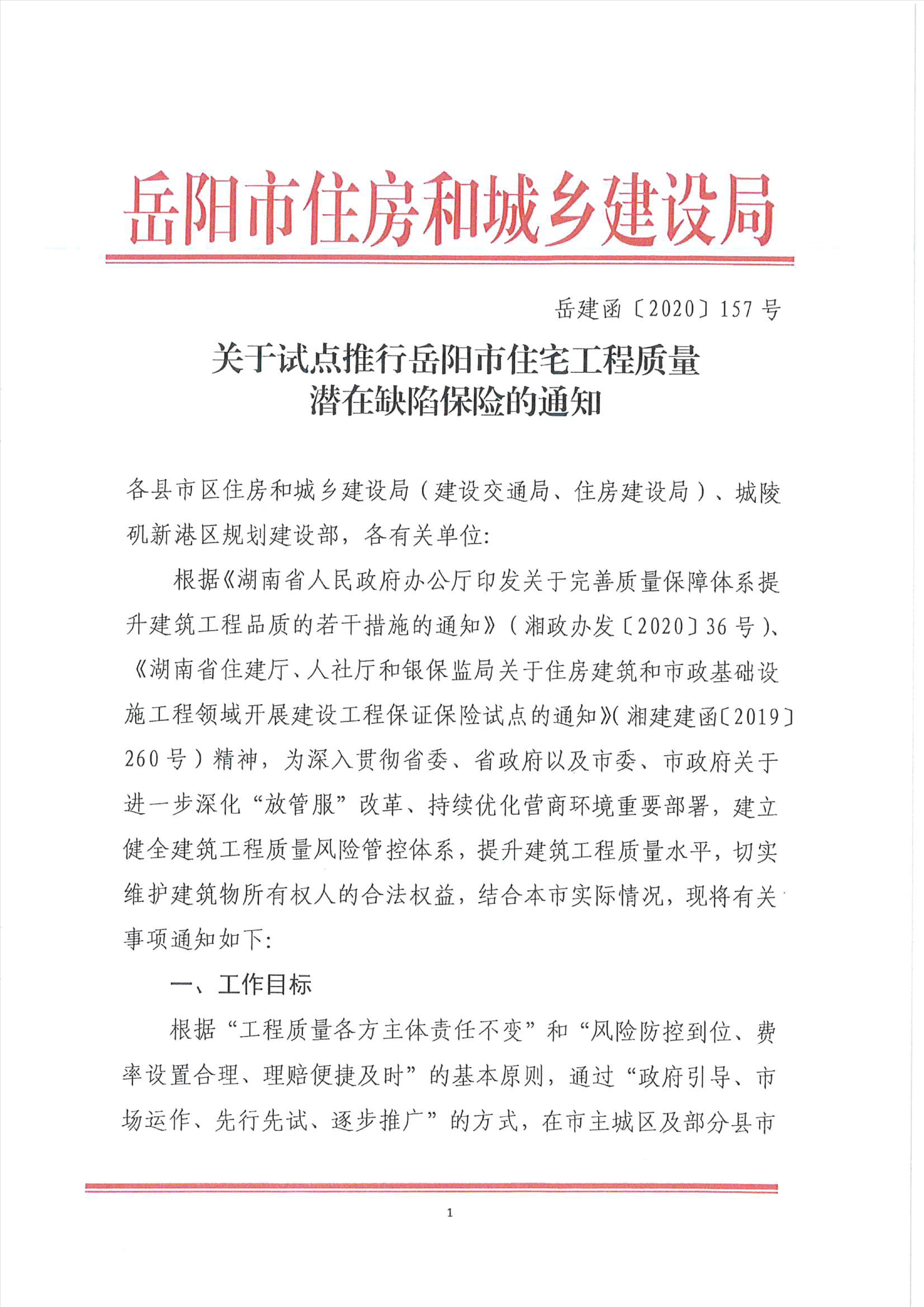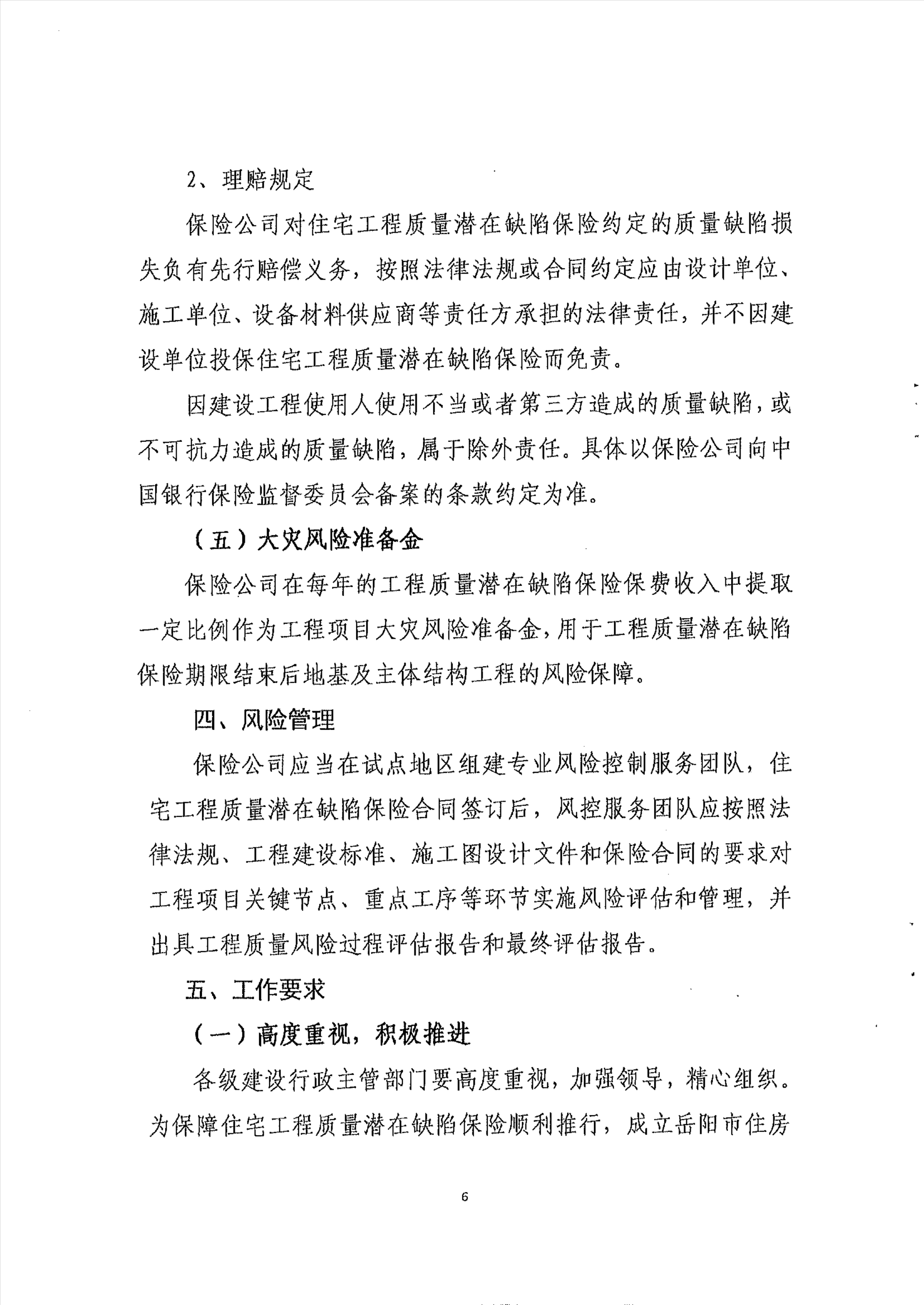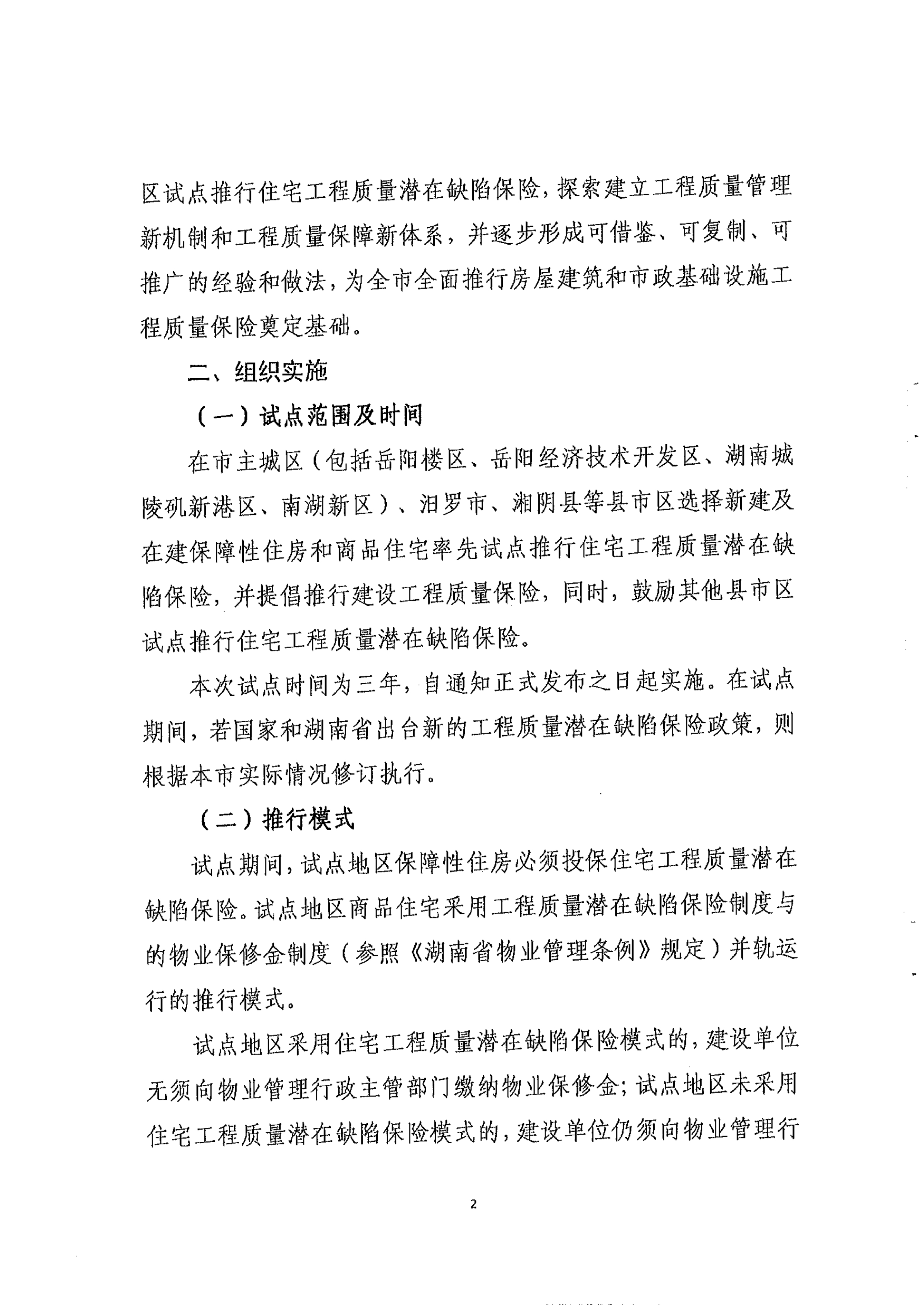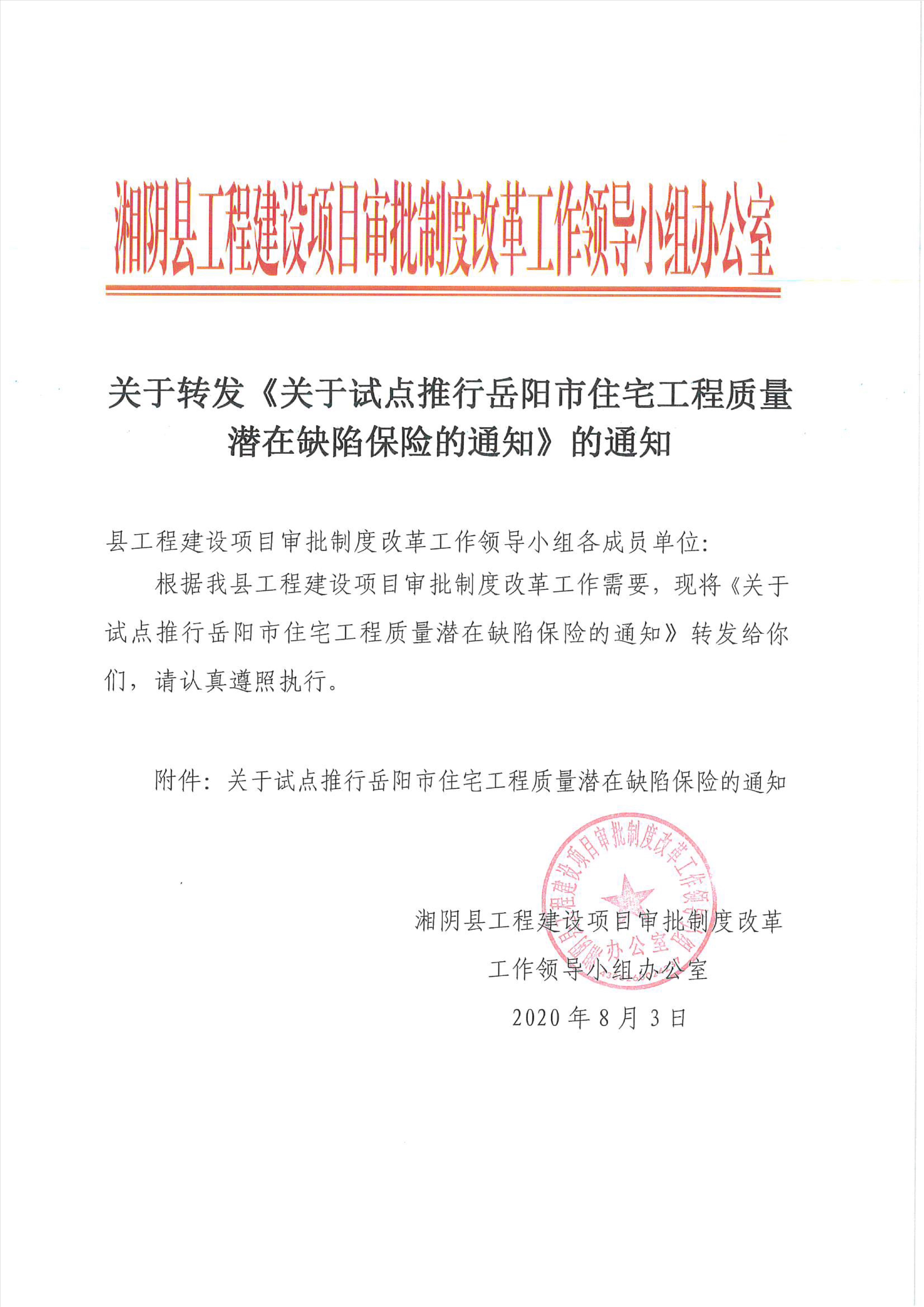 关于转发《关于试点推行岳阳市住宅工程质量潜在缺陷保险的通知》的通知