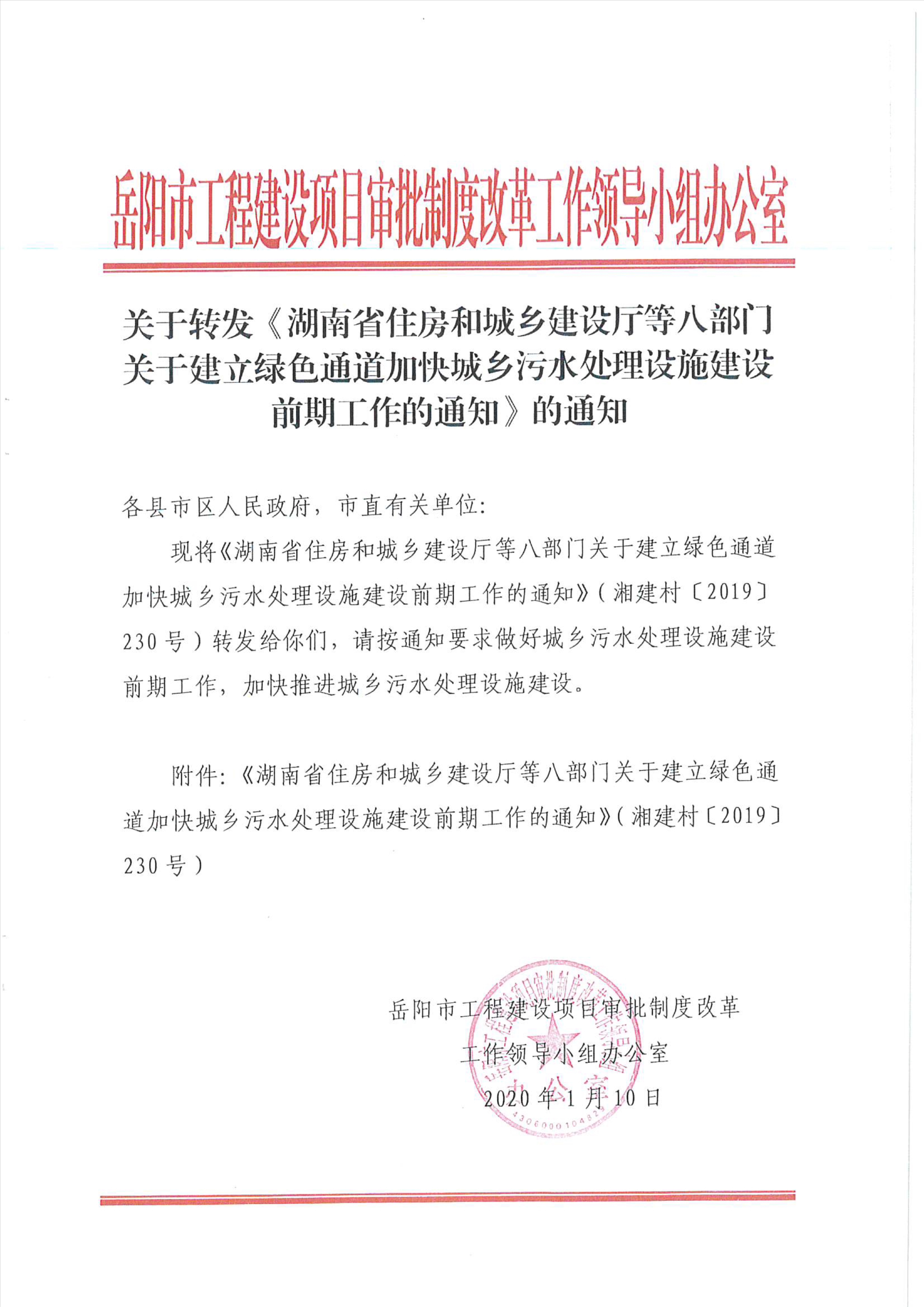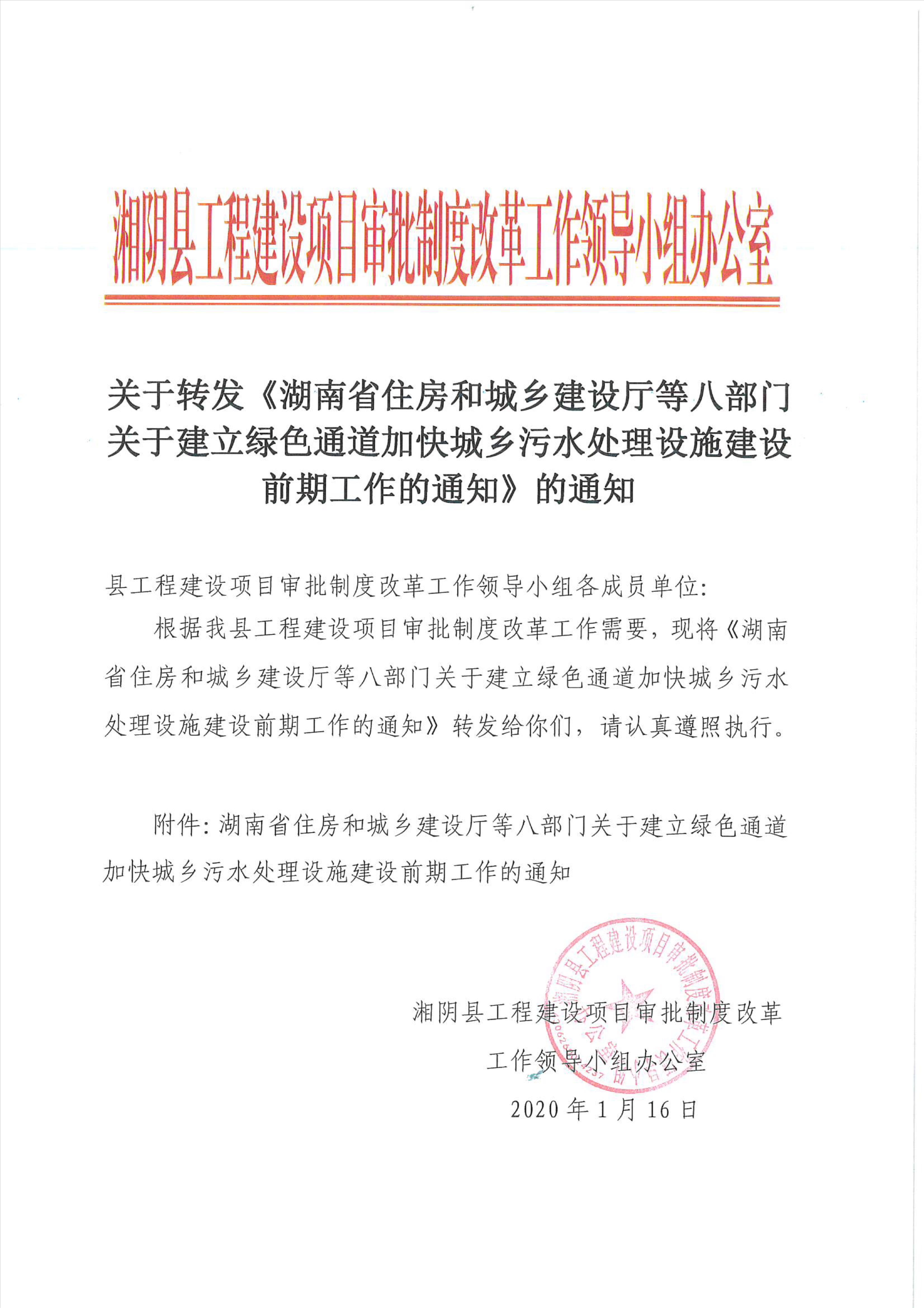关于转发《湖南省住房和城乡建设厅等八部门关于建立绿色通道加快城乡污水处理设施建设前期工作的通知》的通知