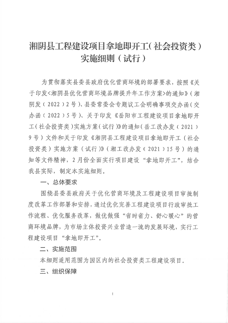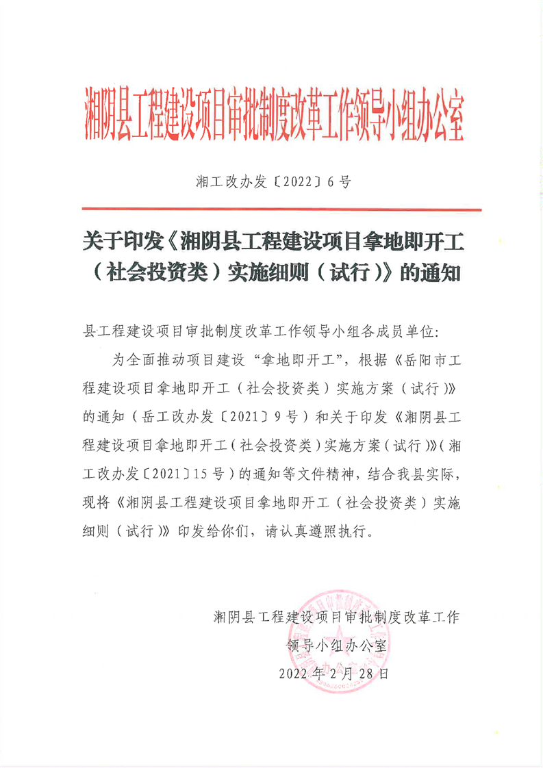 关于印发《湘阴县工程建设项目拿地即开工(社会投资类)实施细则(试行)》的通知