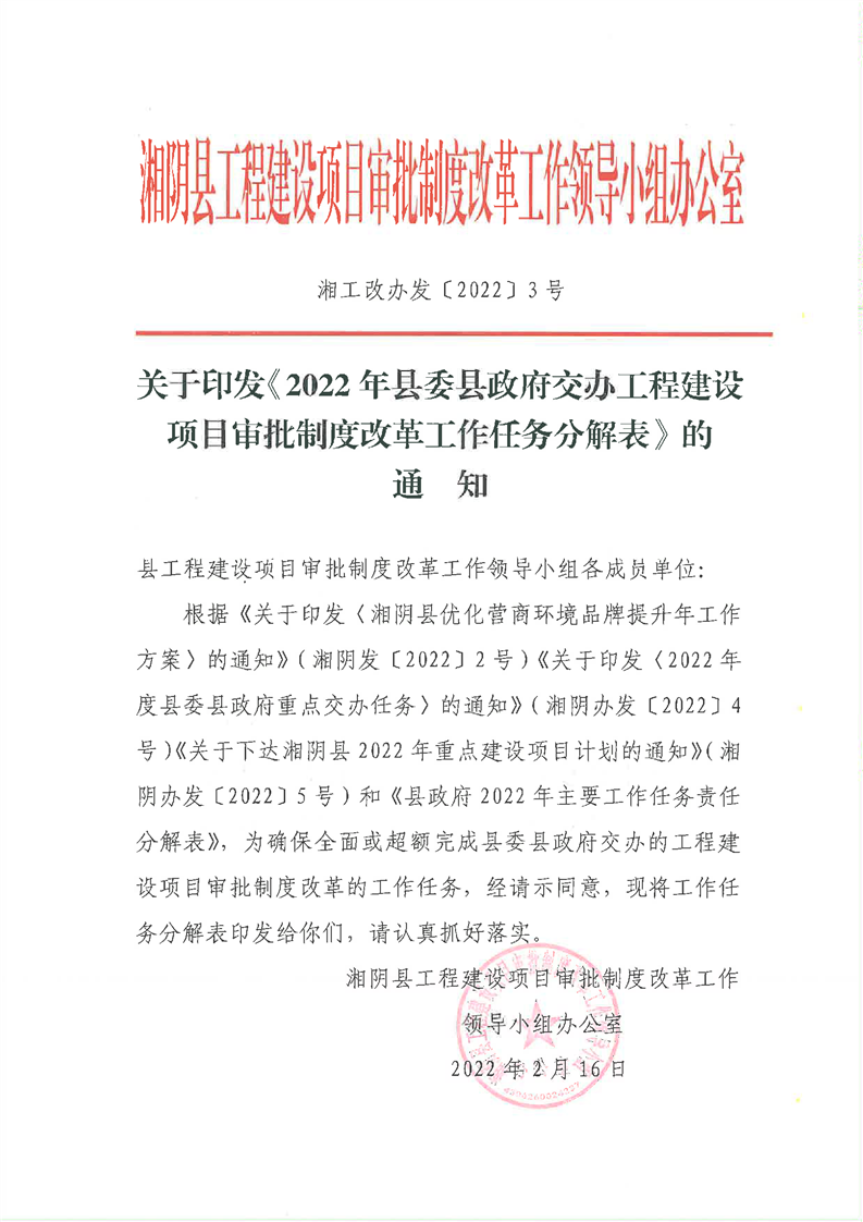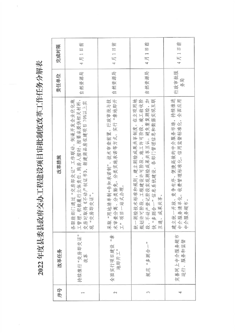 关于印发《2022年县委县政府交办工程建设项目审批制度改革工作任务分解表》的通知