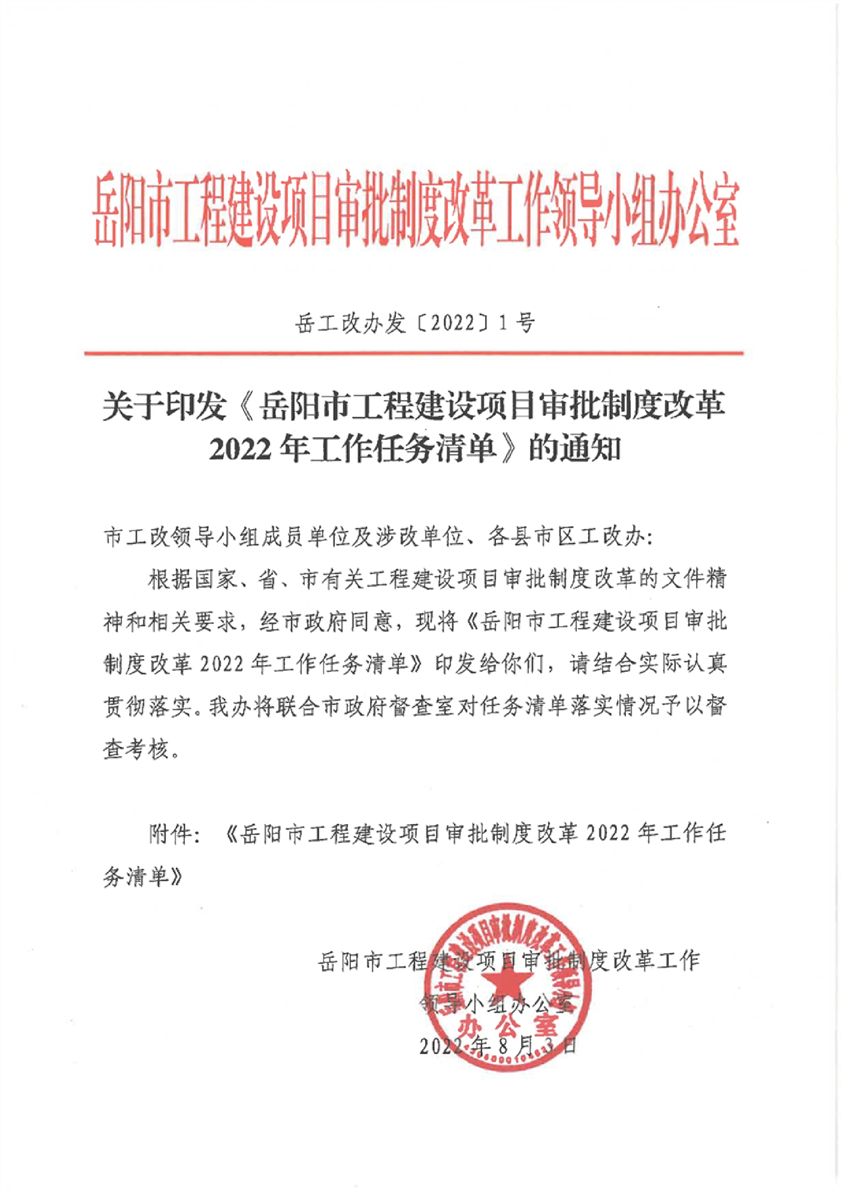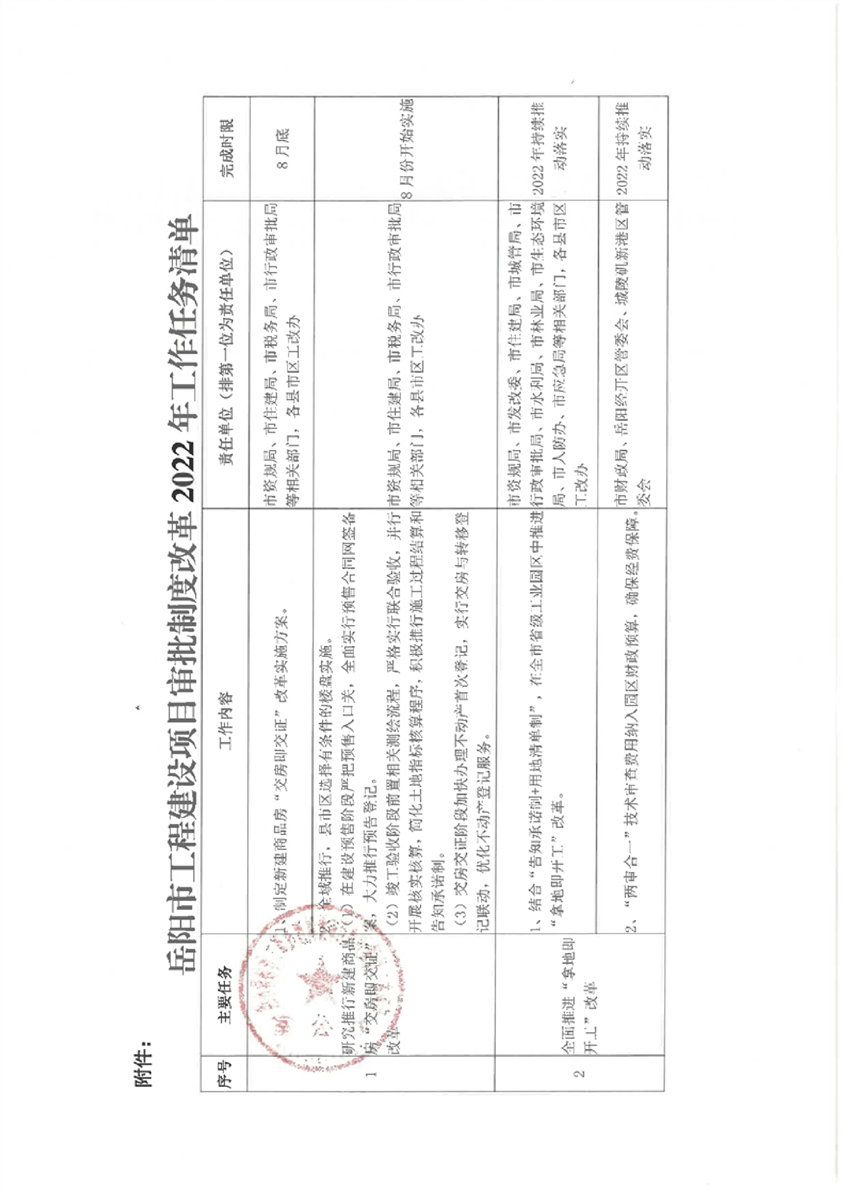 岳阳市工程建设项目审批制度改革2022年工作任务清单