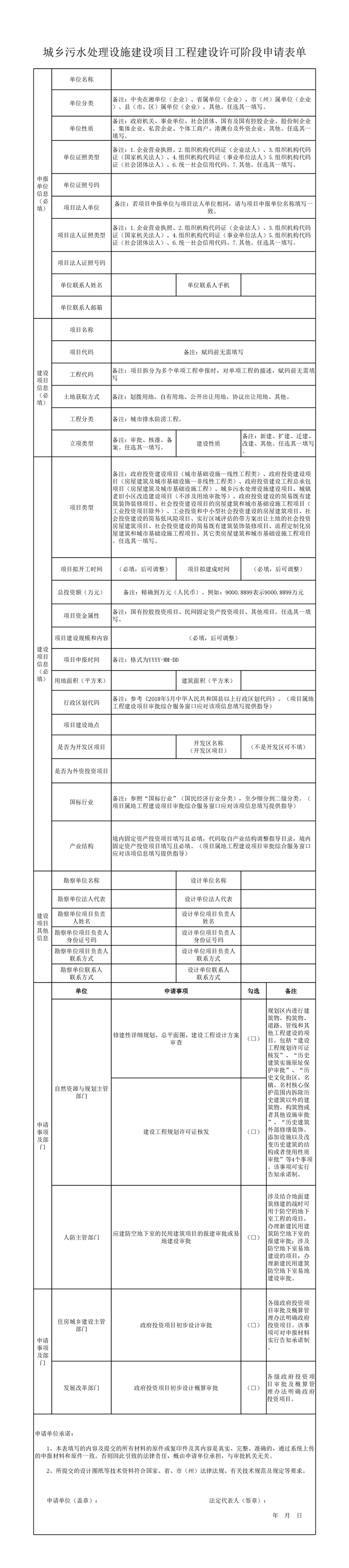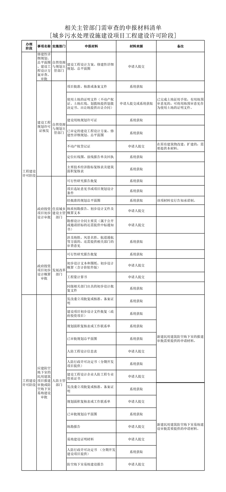 城乡污水处理设施建设项目工程建设许可阶段申请表单、申报材料清单