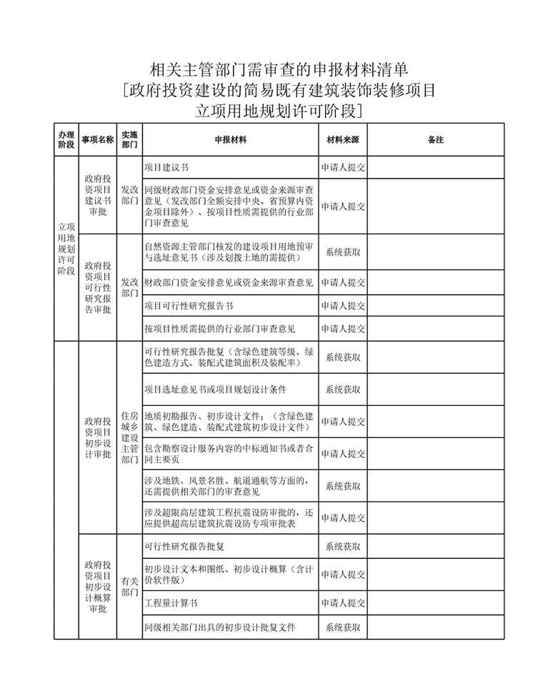 政府投资建设的简易既有建筑装饰装修项目立项用地规划许可阶段申请表、申报材料清单