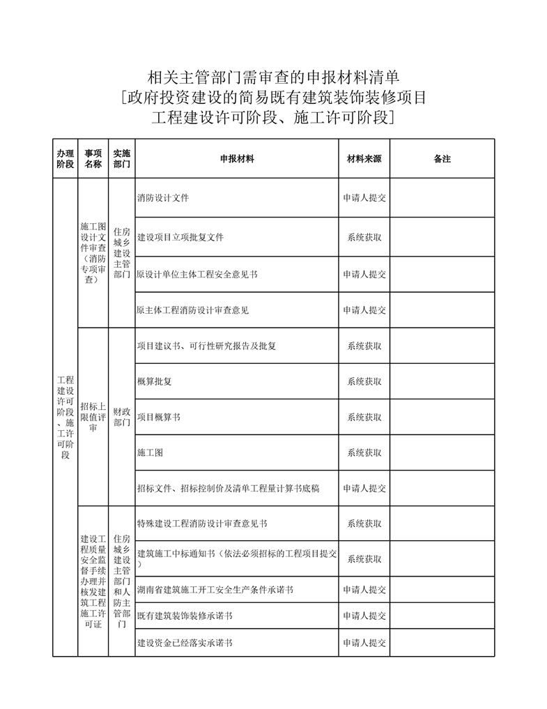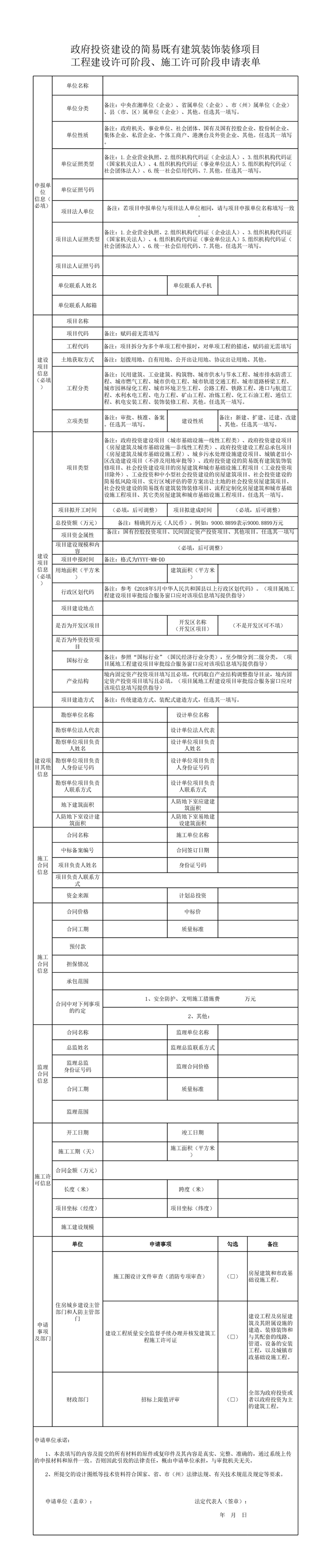 政府投资建设的简易既有建筑装饰装修项目工程建设许可阶段、施工许可阶段申请表、申报材料清单