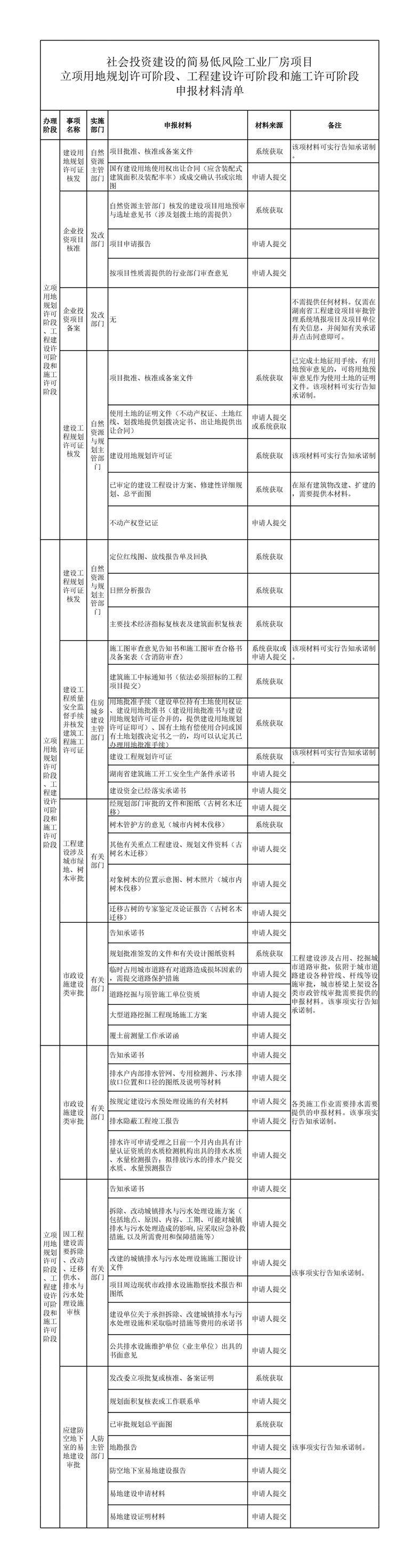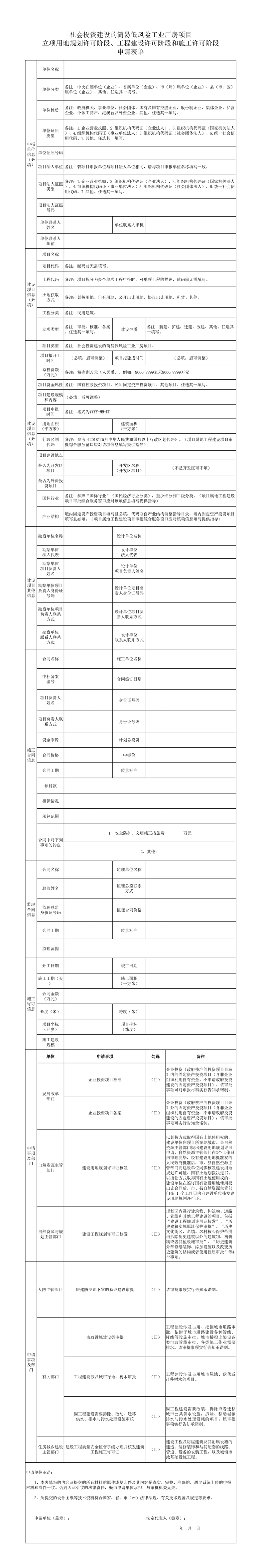 社会投资建设的简易低风险工业厂房项目立项用地规划许可阶段、工程建设许可阶段和施工许可阶段申请表单、申报材料清单
