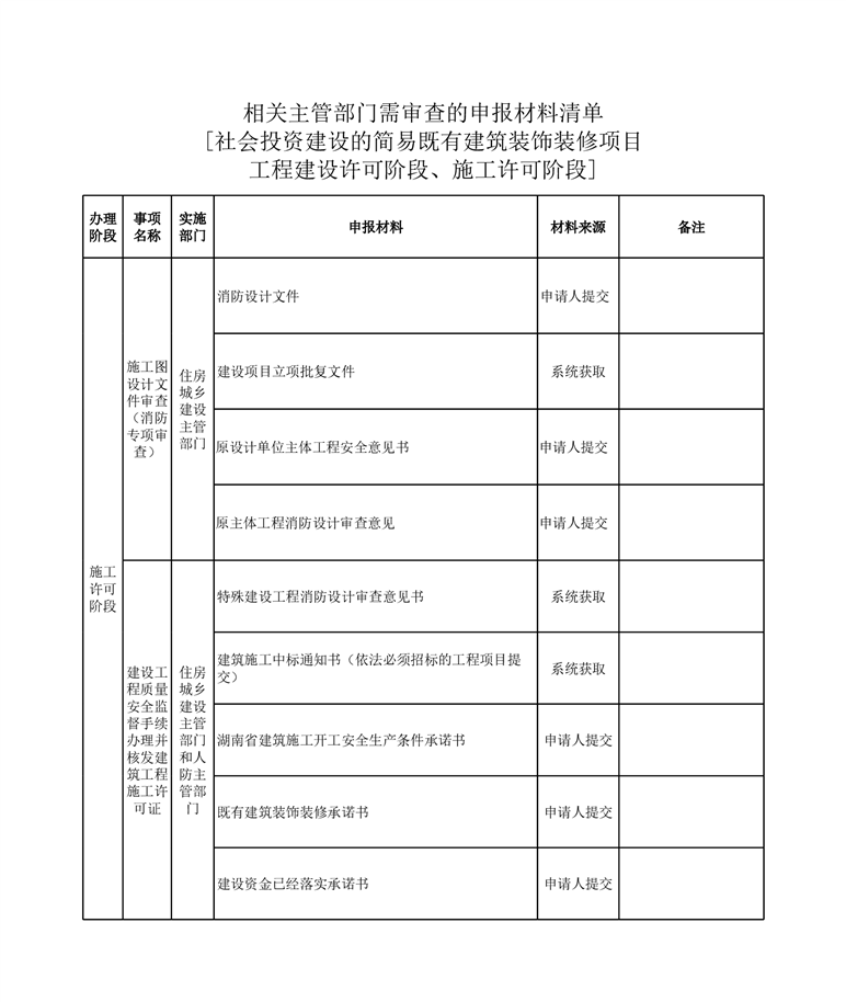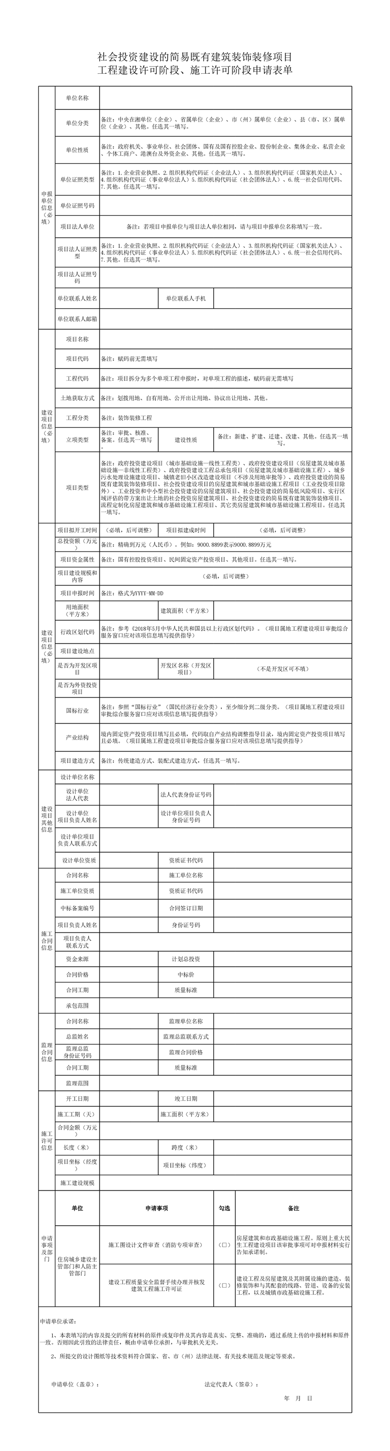 社会投资建设的简易既有建筑装饰装修项目工程建设许可阶段、施工许可阶段申请表单、申报材料清单