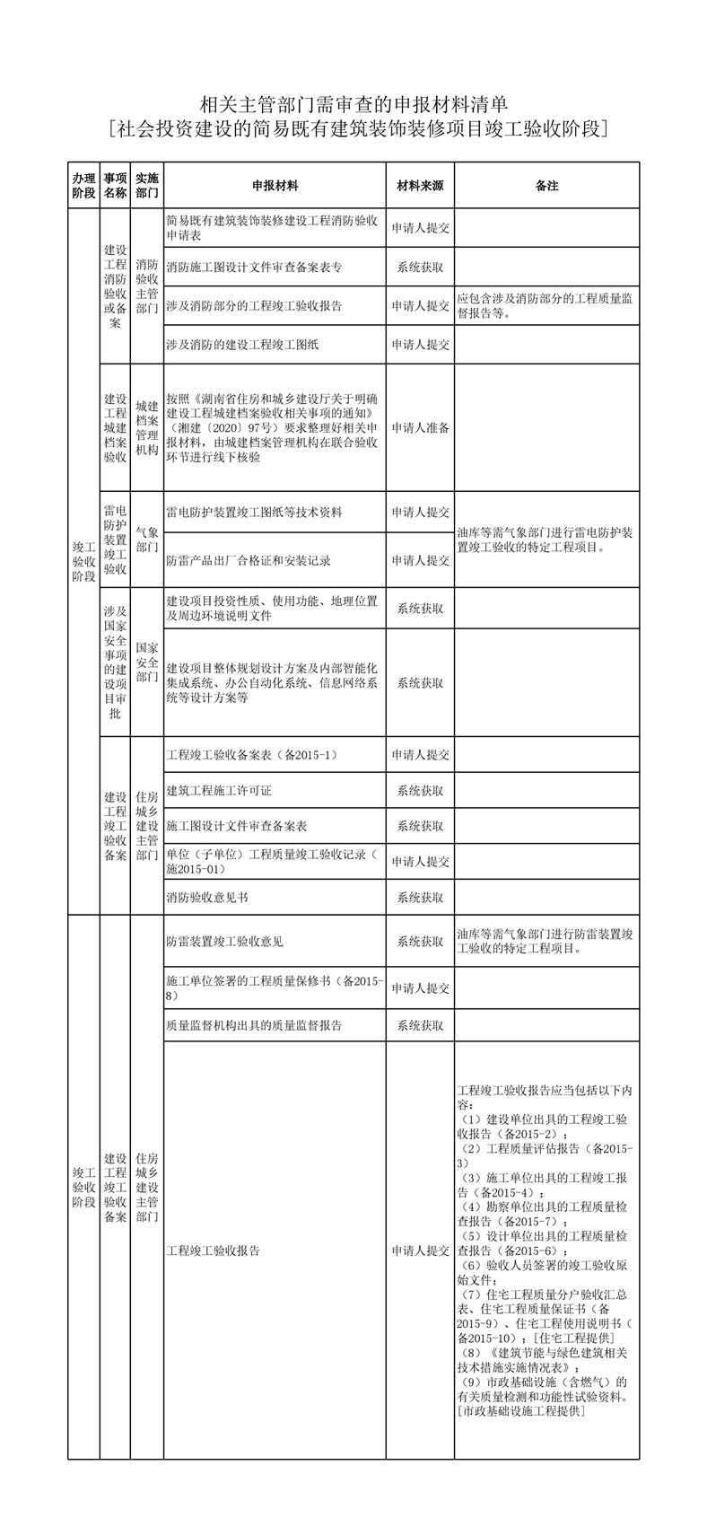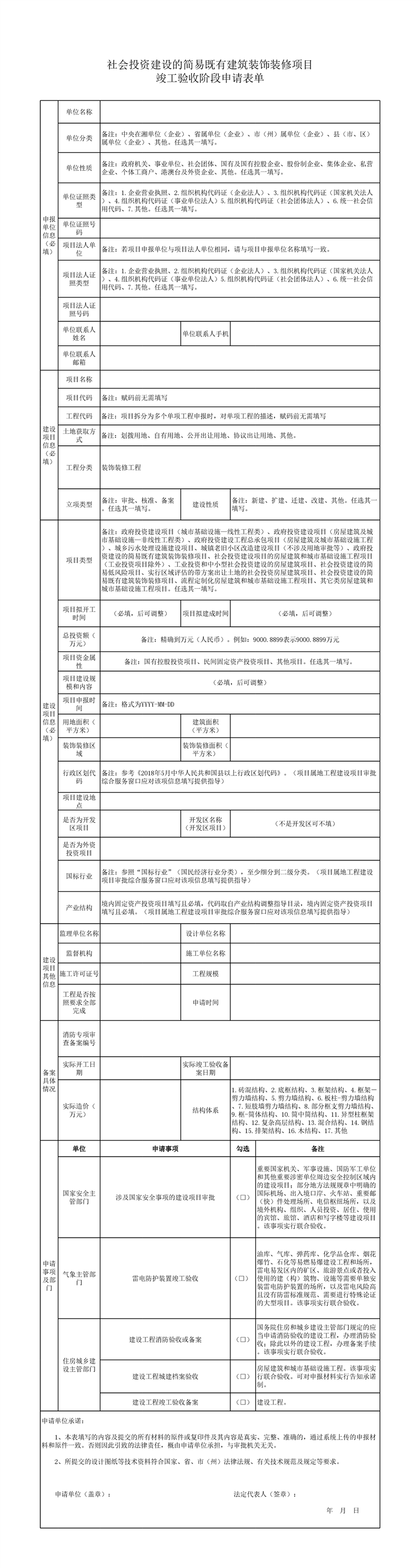社会投资建设的简易既有建筑装饰装修项目竣工验收阶段申请表单、申报材料清单