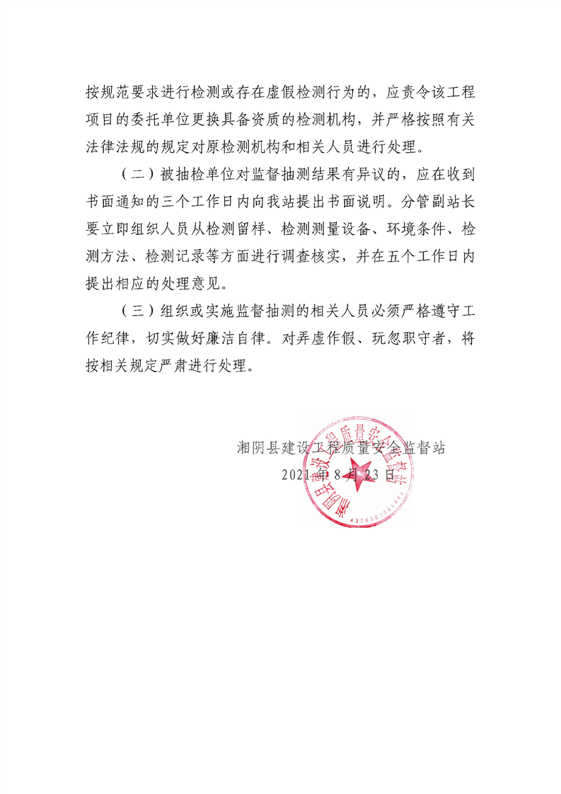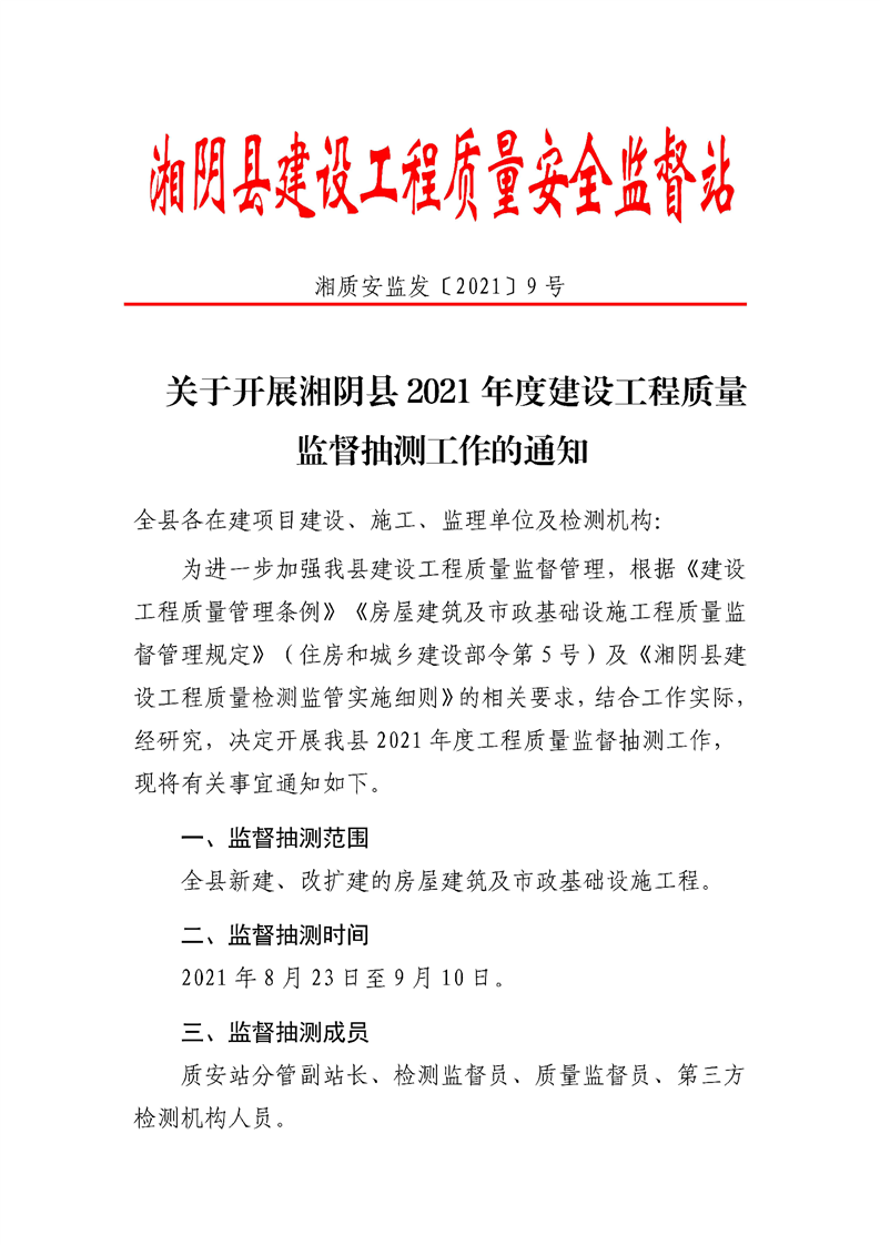 关于开展湘阴县2021年度建设工程质量监督抽测工作的通知
