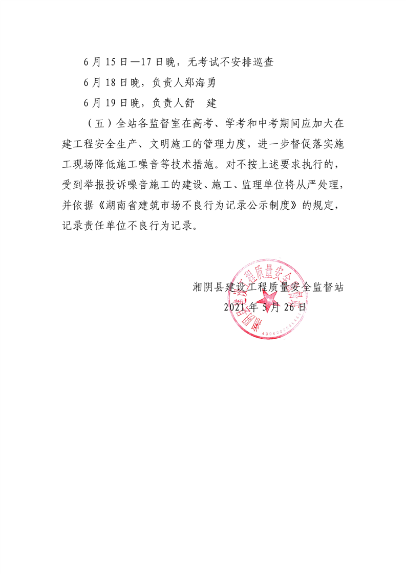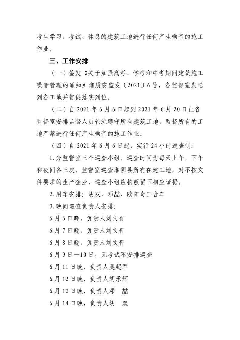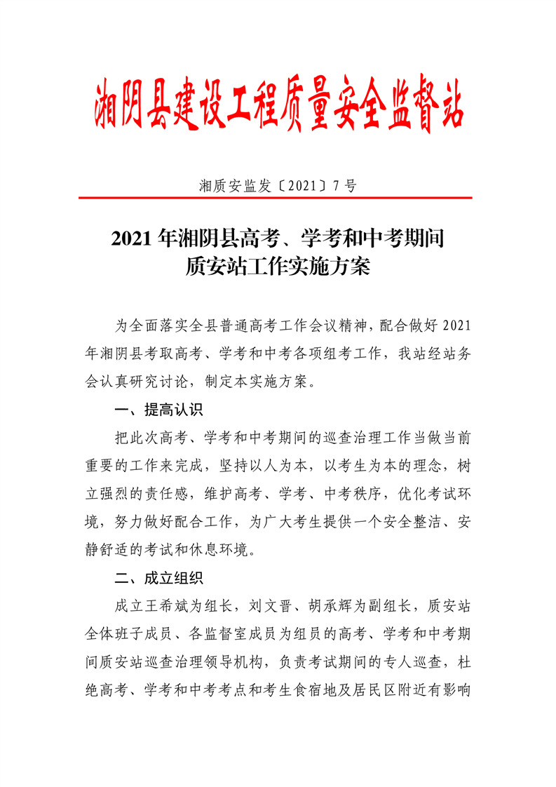 2021年湘阴县高考、学考和中考期间质安站工作实施方案