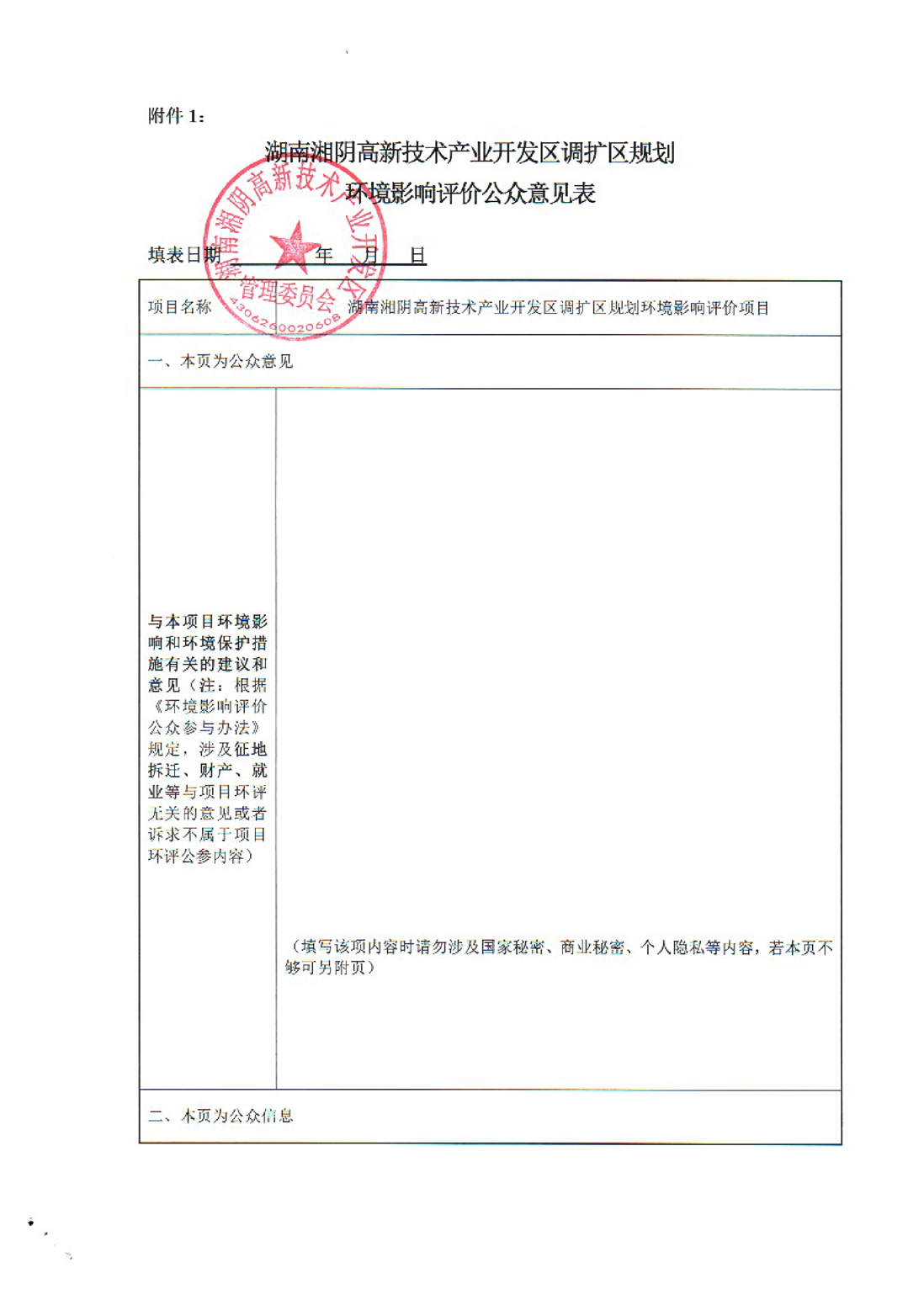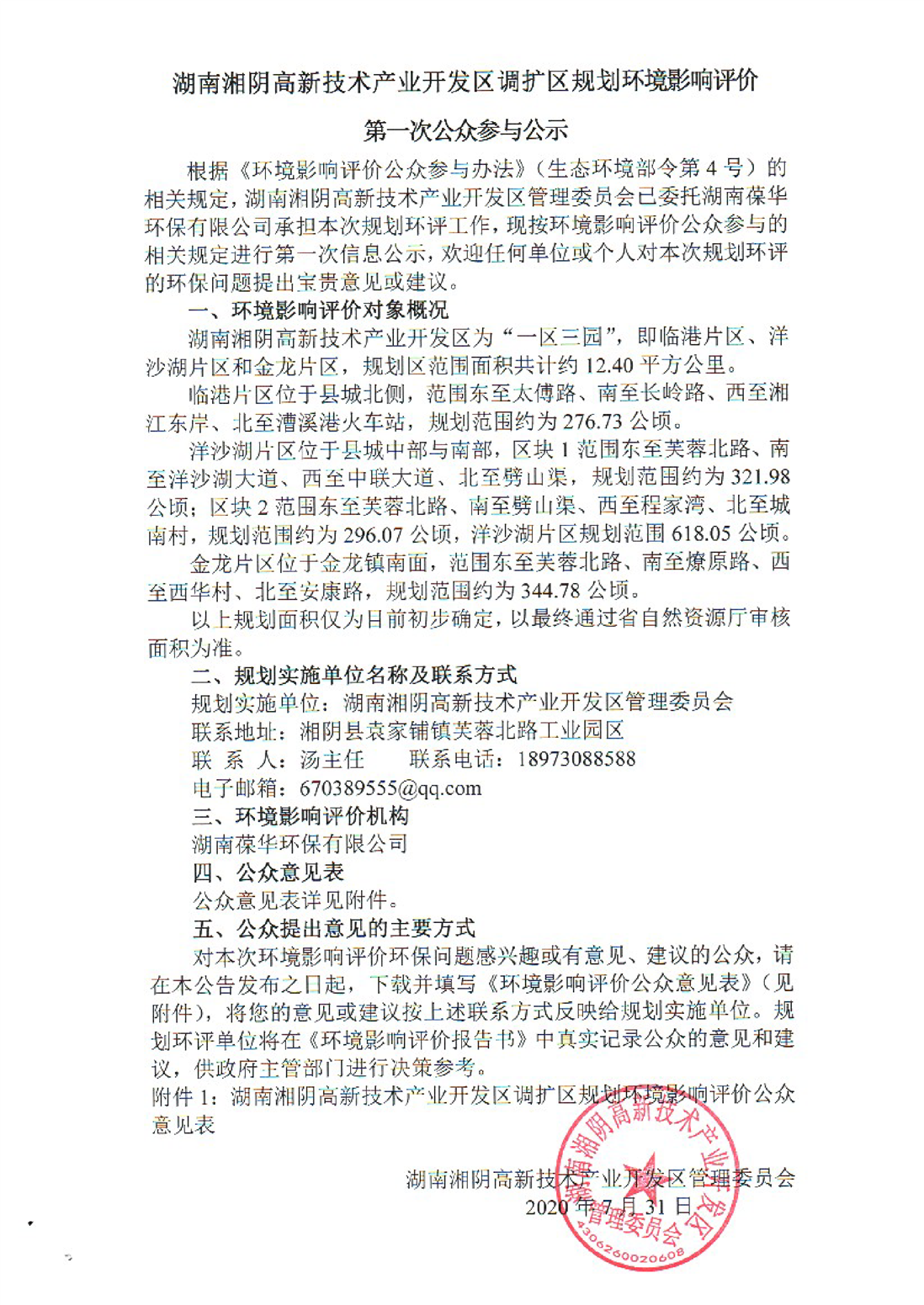 湖南湘阴高新技术产业开发区调扩区规划环境影响评价第一次公众参与公示