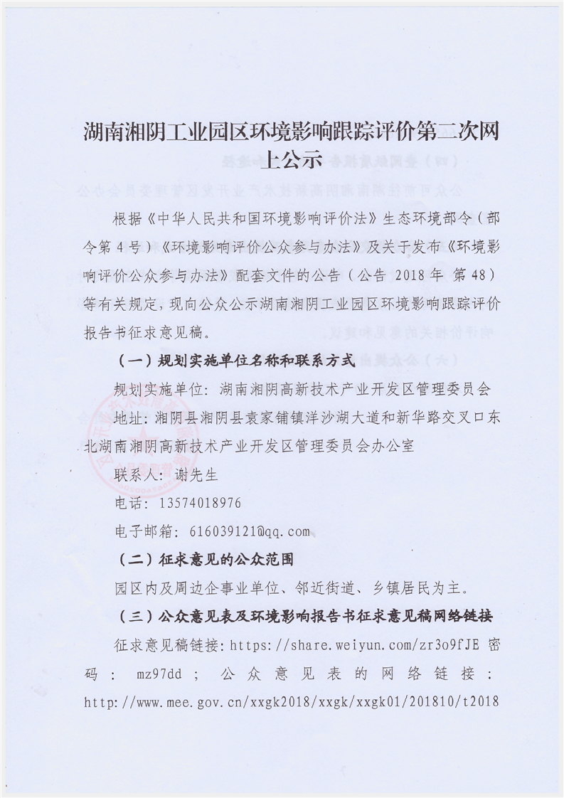 湖南省湘阴县工业园区环境影响跟踪评价第二次网上公示
