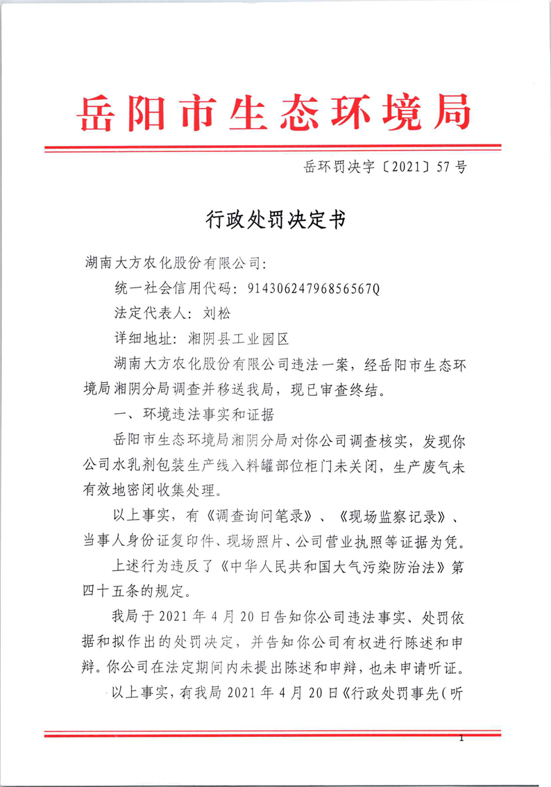 行政处罚决定书(湖南大方农化股份有限公司)