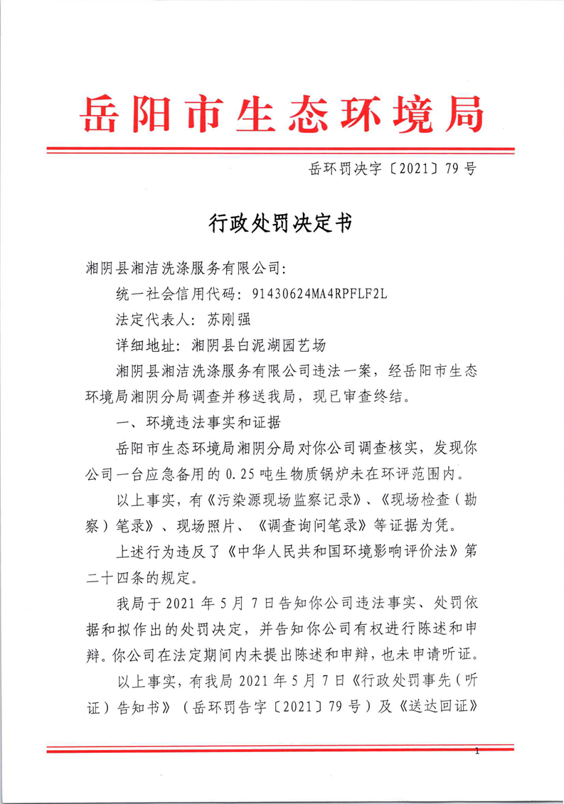 行政处罚决定书(湘阴县湘洁洗涤服务有限公司)