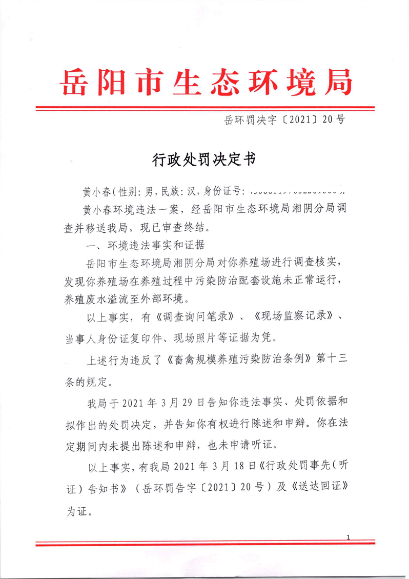 行政处罚决定书(黄小春)