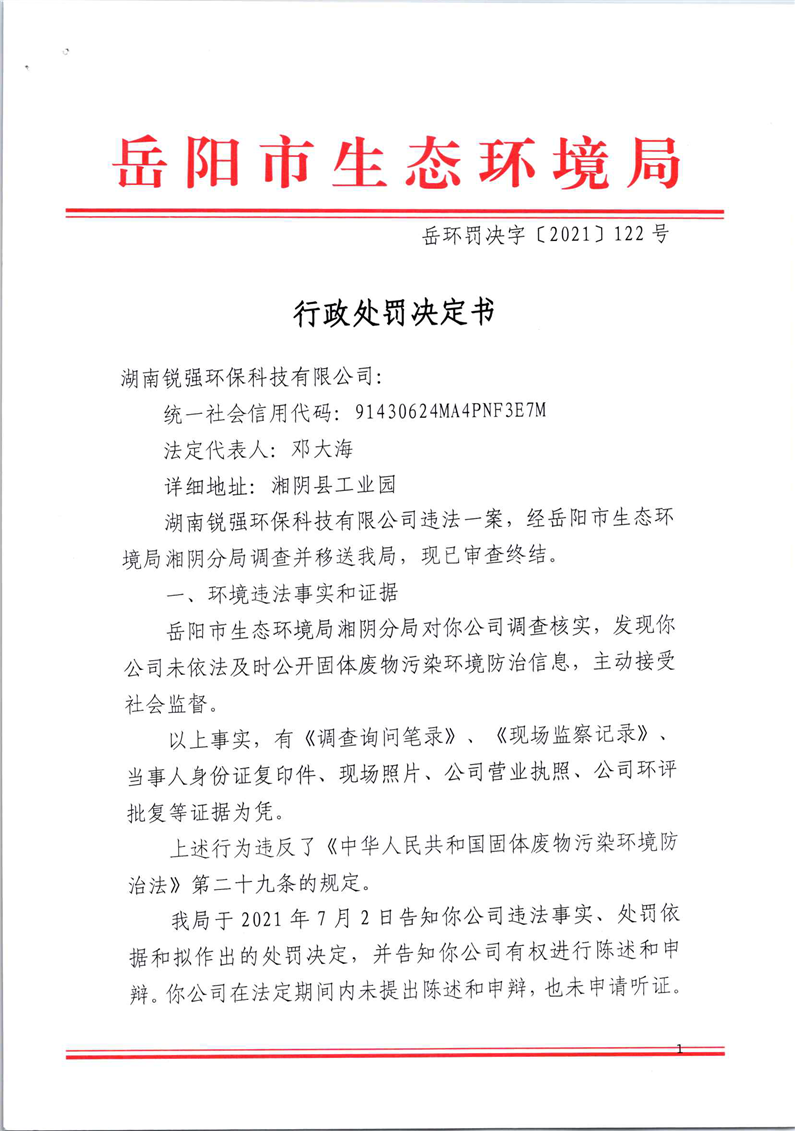 行政处罚决定书(湖南锐强环保科技有限公司)