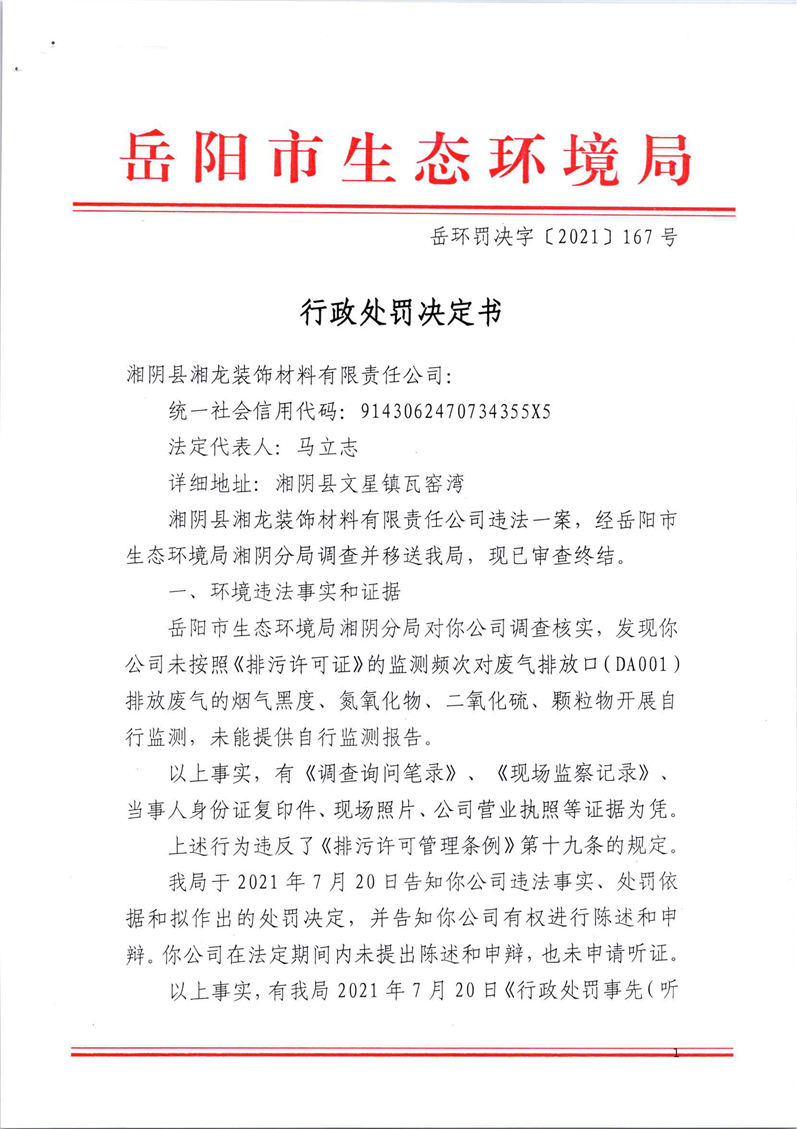 行政处罚决定书(湘阴县湘龙装饰材料有限责任公司)