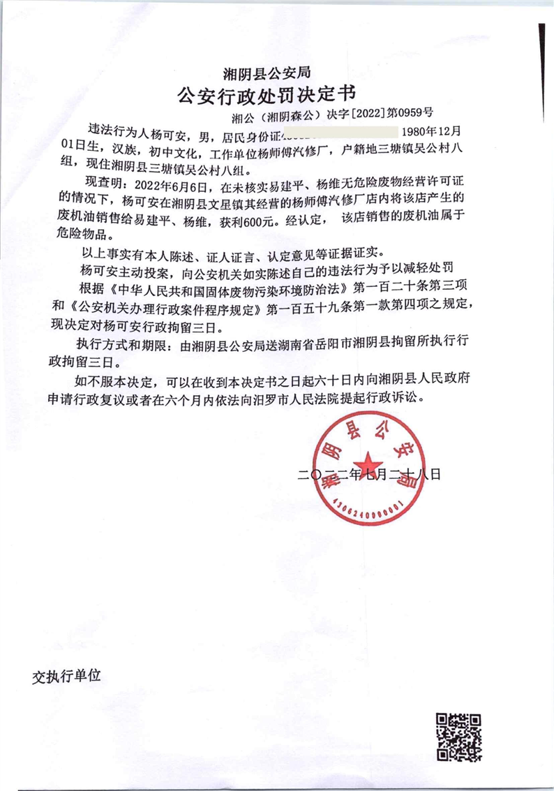公安行政处罚决定书 湘公(湘阴森公)决字【2022】第0959号