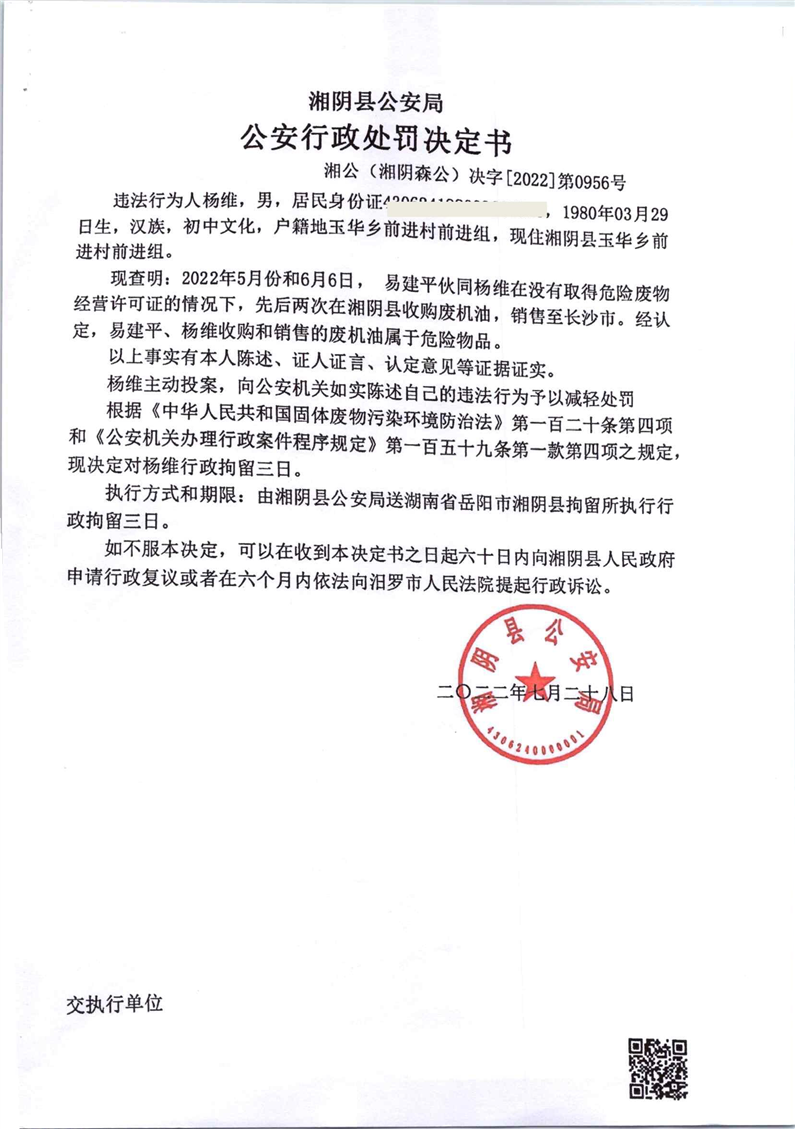 公安行政处罚决定书 湘公(湘阴森公)决字【2022】第0956号