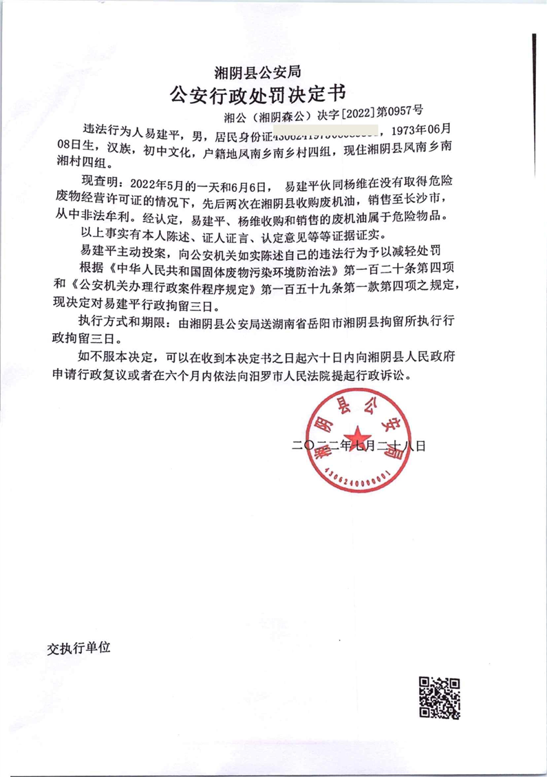 公安行政处罚决定书 湘公(湘阴森公)决字【2022】第0957号