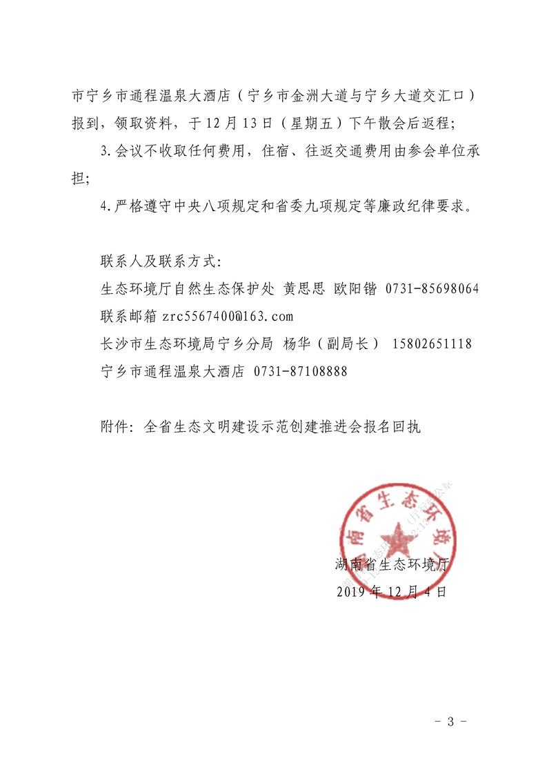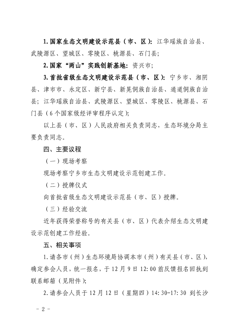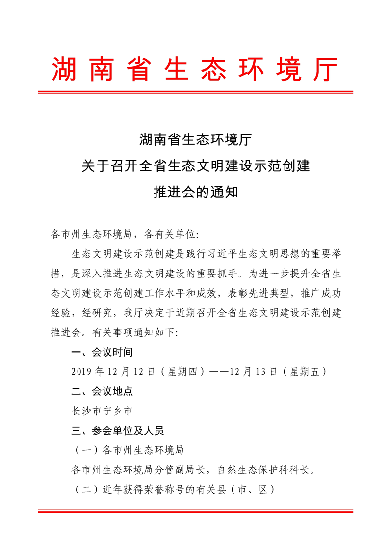 湖南省生态环境厅关于召开全省生态文明建设示范创建推进会的通知
