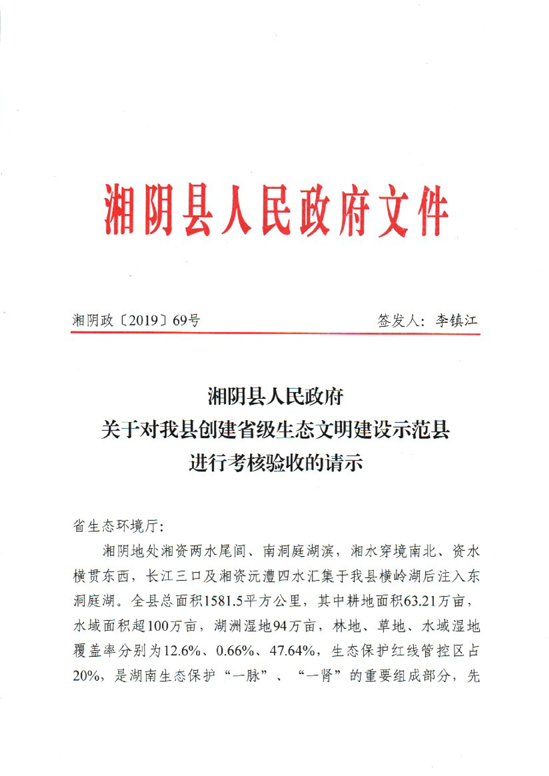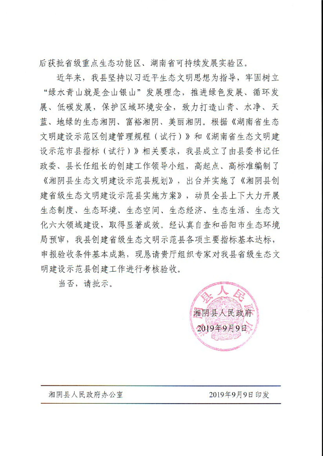 关于对我县创建省级生态文明建设示范县进行考核验收的请示