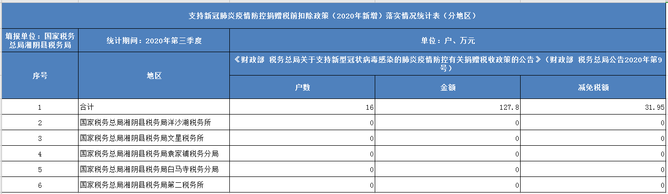 支持新冠肺炎疫情防控捐赠税前扣除政策(2020年新增)落实情况统计表(分地区)