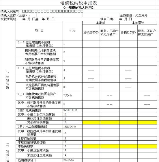 答:1、在当期《增值税纳税申报表(小规模纳税人适用)》(以下简称小规模纳税人申报表)第12栏“其他免税销售额”相关列次,填报免税销售额;第17栏“本期免税额”相关列次,填报免税额。