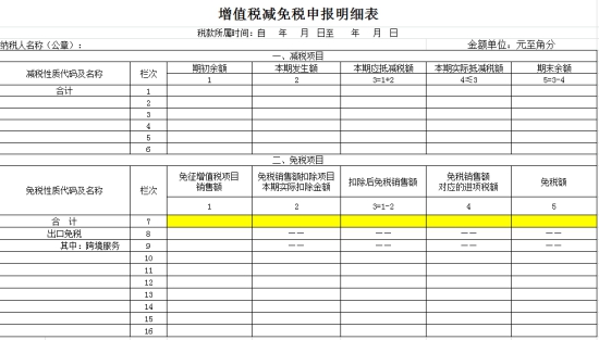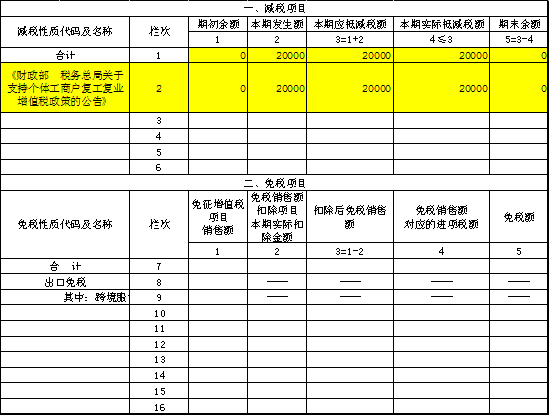 2、在减免税表中选择对应的免税代码,填写相关列次。减免税表中享受疫情防控增值税免税政策的五项减免税性质代码同上。