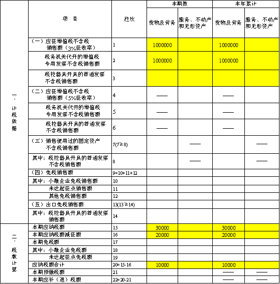 如某企业销售货物含税销售额101万元,开具增值税专用发票,不含税销售额100万元,填入小规模纳税人申报表第1栏、第2栏的“货物及劳务”列,按3%计算的税额3万元填入第13栏“本期应纳税额”,按2%计算的减征额2万元填入第16栏“本期应纳税额减征额”及减免税表减税项目相应栏次,按1%计算的实际应纳税额1万元小规模纳税人申报表第20栏“应纳税额合计”。