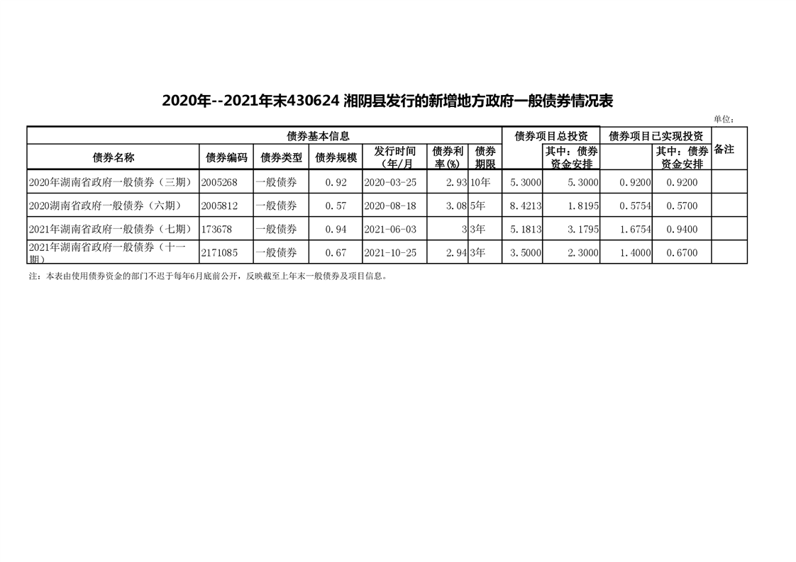 2020年-2021年末湘阴县发行的新增地方政府一般债券情况表