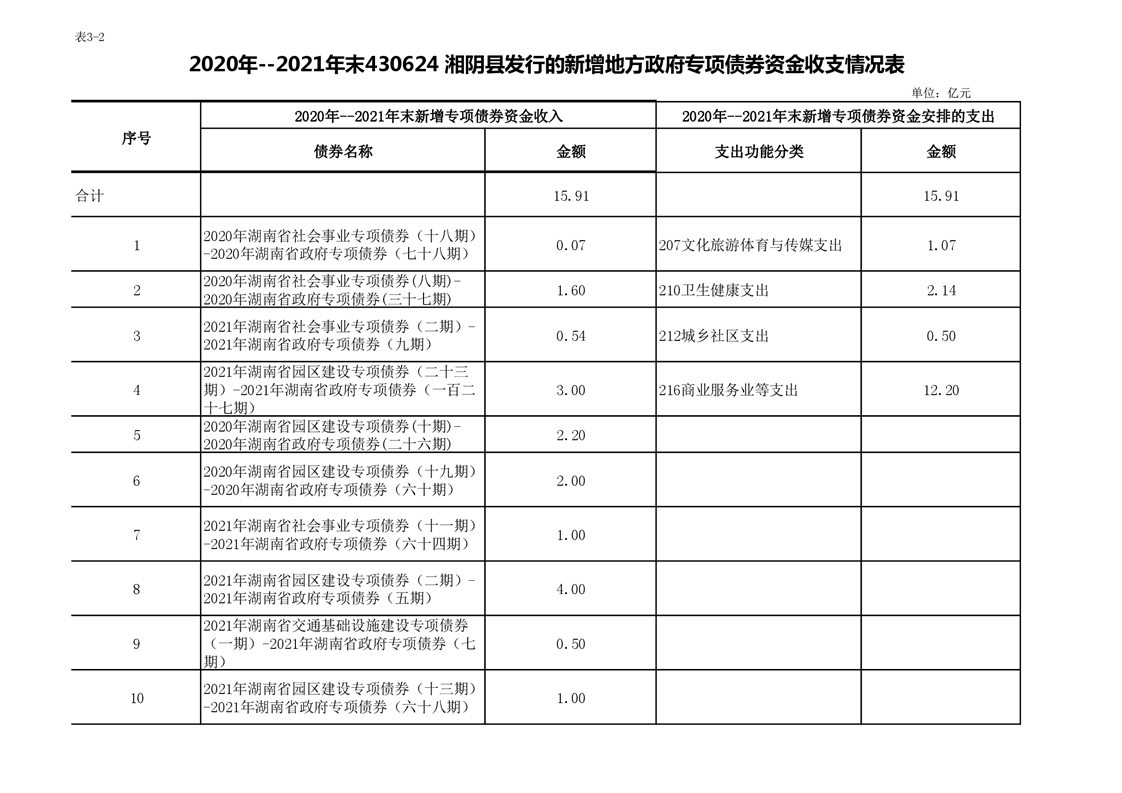 2020年-2021年末湘阴县发行的新增地方政府专项债券资金收支情况表
