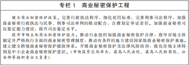 注:①“每万人口高价值发明专利拥有量”是指每万人口本国居民拥有的经国家知识产权局授权的符合下列任一条件的有效发明专利数量:1.战略性新兴产业的发明专利;2.在海外有同族专利权的发明专利;3.维持年限超过10年的发明专利;4.实现较高质押融资金额的发明专利;5.获得国家科学技术奖、中国专利奖的发明专利。 ②“知识产权质押融资登记金额”是指经国家知识产权局登记的知识产权质押融资金额。 ③④为2019年值。 三、全面加强知识产权保护,激发全社会创新活力 (四)完善知识产权法律政策体系。 健全知识产权法律法规。开展知识产权基础性法律研究。统筹推进专利法、商标法、著作权法、反垄断法、科学技术进步法、电子商务法等相关法律法规的修改完善。加强地理标志、商业秘密等领域立法,出台商业秘密保护规定。完善集成电路布图设计法规。推进修订植物新品种保护条例。制定中医药传统知识保护条例。完善与国防建设相衔接的知识产权法律制度。全面建立并实施知识产权侵权惩罚性赔偿制度,加大损害赔偿力度。研究建立健全符合知识产权审判规律的特别程序法律制度。适应科技进步和经济社会发展需要,依法及时推动知识产权法律法规立改废释。(中央宣传部、最高人民法院、最高人民检察院、科技部、工业和信息化部、司法部、农业农村部、商务部、国家卫生健康委、市场监管总局、国家国防科工局、国家林草局、国家中医药局、国家知识产权局、中央军委装备发展部等按职责分工负责)