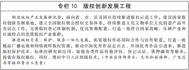 厚植知识产权文化理念。增强全社会尊重和保护知识产权的意识,推动知识产权文化与法治文化、传统文化、创新文化、诚信文化深度融合。大力宣传锐意创新和诚信经营的典型企业,引导企业自觉履行尊重和保护知识产权的社会责任。开展贴近时代、贴近百姓、贴近生活的知识产权文化惠民活动。加强知识产权文化基础设施建设。探索建立“互联网+”知识产权保护云博物馆。加大对中西部地区知识产权文化建设投入。开展知识产权文化建设理论和学术研究,以文化为媒,提升文化软实力。(国家知识产权局牵头,中央宣传部、司法部、文化和旅游部等按职责分工负责) 八、实施保障 (十八)加强组织领导。 坚持党对知识产权工作的全面领导,充分发挥国务院知识产权战略实施工作部际联席会议作用,完善工作机制,形成工作合力,确保党中央、国务院关于知识产权工作的各项决策部署落到实处。各地区、各有关部门要强化责任意识,密切协调配合,结合实际进一步明确工作重点,落实好本规划部署的各项任务措施。国家知识产权局要加强组织协调,明确责任分工,细化目标任务,加强宣传解读,制定年度推进计划,确保规划有序推进。相关社会组织和行业协会要积极参与规划实施,主动作为,发挥作用。(国家知识产权局牵头,有关部门与地方各级人民政府按职责分工负责) (十九)鼓励探索创新。 各地要发扬基层首创精神,针对规划实施中的痛点、难点问题,主动作为、创新思路,积极探索积累务实管用、科学精准的具体举措,不断丰富完善有关政策措施。各有关部门要营造有利环境,支持有条件的地区先行先试。(地方各级人民政府与有关部门按职责分工负责) (二十)加大投入力度。 完善多渠道投入机制,推进规划重大工程项目落地,促进规划有效实施。加强对知识产权工作的政策和资源支持。鼓励社会资本积极参与,创新投入模式和机制,充分发挥市场在资源配置中的决定性作用。(有关部门与地方各级人民政府按职责分工负责) (二十一)狠抓工作落实。 国家知识产权局会同有关部门加强对规划实施情况的跟踪监测,通过第三方评估等形式开展规划实施的中期评估、总结评估,总结推广典型经验做法,发现规划实施中存在的问题并研究解决对策。强化监督检查,确保任务落实,重要情况及时报告国务院。(国家知识产权局牵头,有关部门按职责分工负责) |