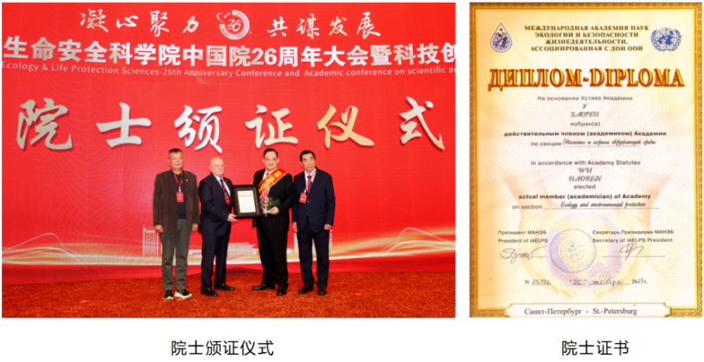 12月10日联合国生态生命安全科学院为新晋院士颁发证书,湖南省茶业集团副董事长、总工程师、中国产业海外发展协会副会长吴浩人当选该院院士! 全国政协常委、第十三届全国政协副秘长赖明,联合国国际生态生命安全科学院第一副主席维塔利、联合国国际生态生命安全科学院中国院院长黄正明为吴浩人颁发了院士证书。