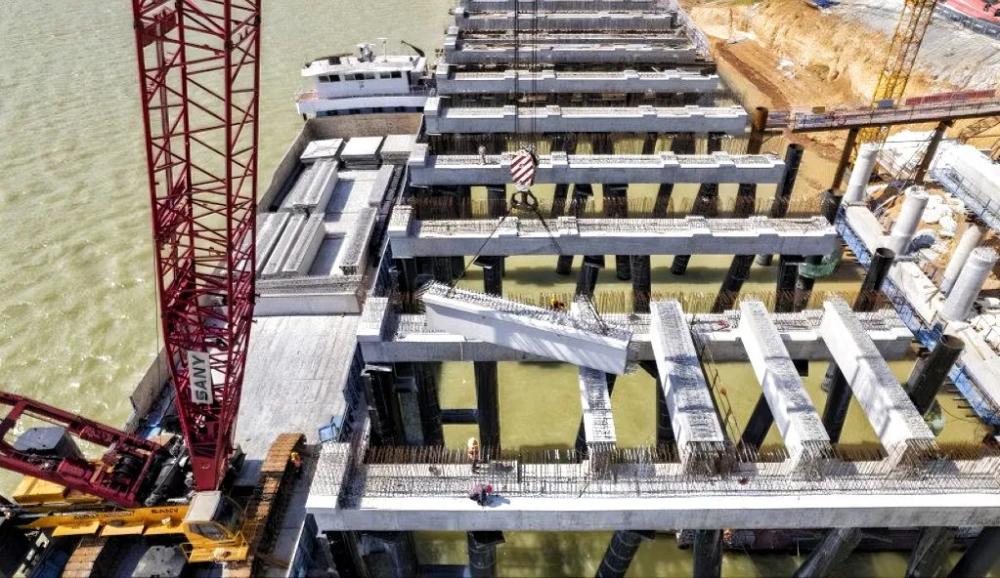 码头平台上部结构施工的顺利实施,对于项目一期工程具有重大意义:眼下,项目每天可吊装两跨预制纵梁,八片预制纵梁为一跨,日均可完成约20片预制纵梁的安装,为项目后续目标打下坚实基础。