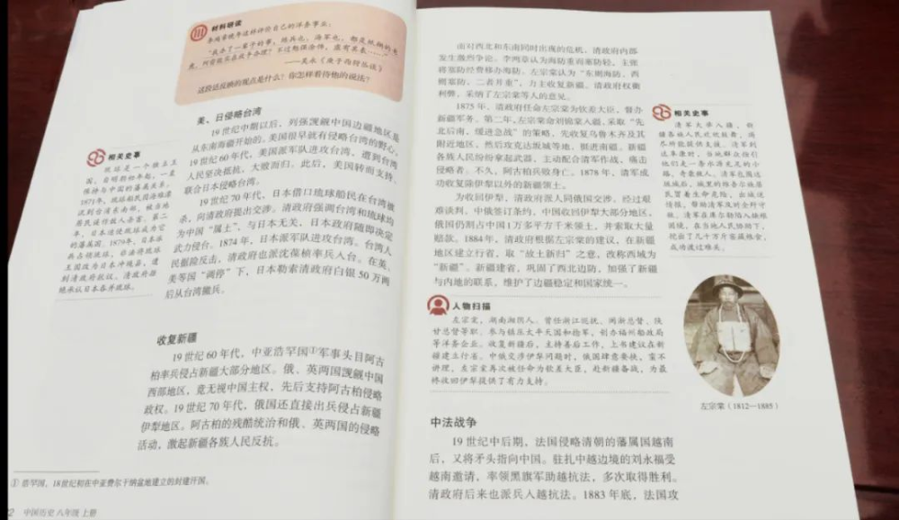 据了解,在今年专门修订的人教版《义务教育教科书中国历史八年级上册》中,第四课内容上新增了“收复新疆”等。“收复新疆”一段详细描述了“清政府任命左宗棠为钦差大臣,督办新疆军务”“左宗棠命刘锦棠入疆,采取‘先北后南,缓进急战’的策略”“清军成功收复除伊犁以外的新疆领土”这段历史。该课本由教育部组织编写,人民教育出版社出版。