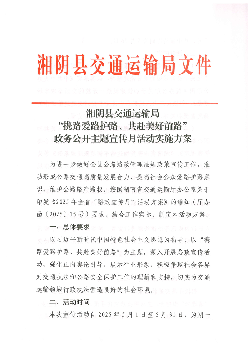 湘阴县交通运输局“携路爱路护路、共赴美好前路”政务公开主题宣传月活动实施方案