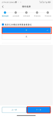 10.选择实际情形(以未办理应急预案备案登记为例),点击“下一步”