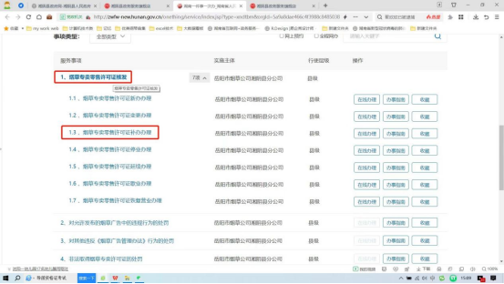 4. 在服务事项中点击“烟草专卖零售许可证核发”中选择“烟草专卖零售许可证补办办理”