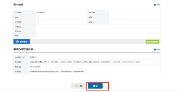 13.再次确认“基本信息”及“事项办结取件信息”,确认无误后,点击“提交”