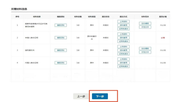 11. 上传资料(“必填”资料必须上传),点击“下一步”