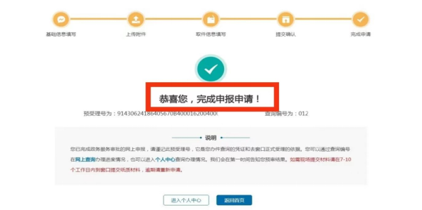 14. 界面显示“恭喜您,完成申请!”已完成政务服务审批的网上申报:可以通过查询编号,在网上查询办理进度情况,也可以进入个人中心查询办理情况