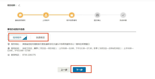 12.可选择“现场取件”/“快递寄送”,点击“下一步”