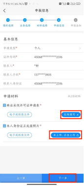 14填写好“林木采伐许可申请表”,上传“身份证正反面照片”,点击“下一步”即完成申报 |