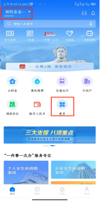 2.主页将左上角地区改到湘阴县本级,然后点击“更多” |