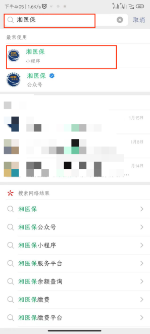 1.在微信搜索栏搜索“湘医保”,点击打开“湘医保”小程序。
