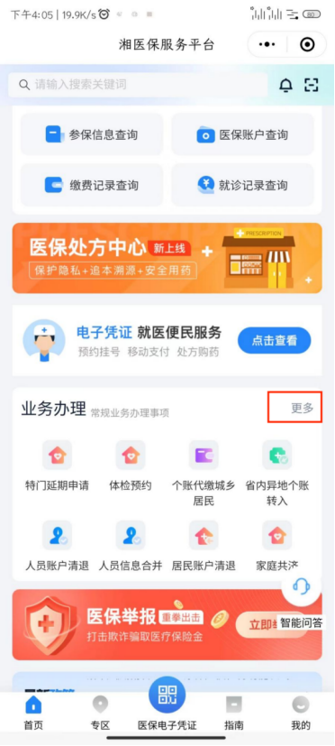 2.在“湘医保”小程序主页,点击“业务办理”、“更多”选项。