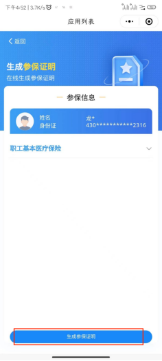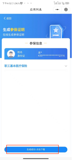 4.以参保证明打印为例,点击打开,点击“生成参保证明”,然后等待生成,再点击“生成成功!点击下载”,即可查看参保证明,再发送至电脑打印。