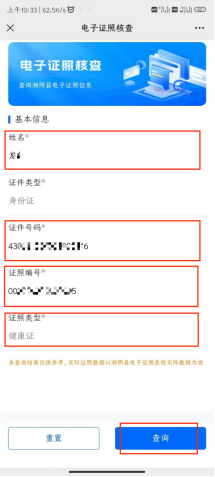 2.输入姓名、身份证号码、健康证编号,选择证照类型为“健康证”,点击查询。