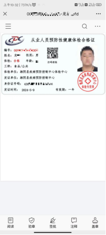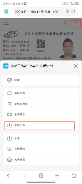 2.输入姓名、身份证号码、健康证编号,选择证照类型为“健康证”,点击查询。查询后点击右上角“...”,选择下载文件即可。